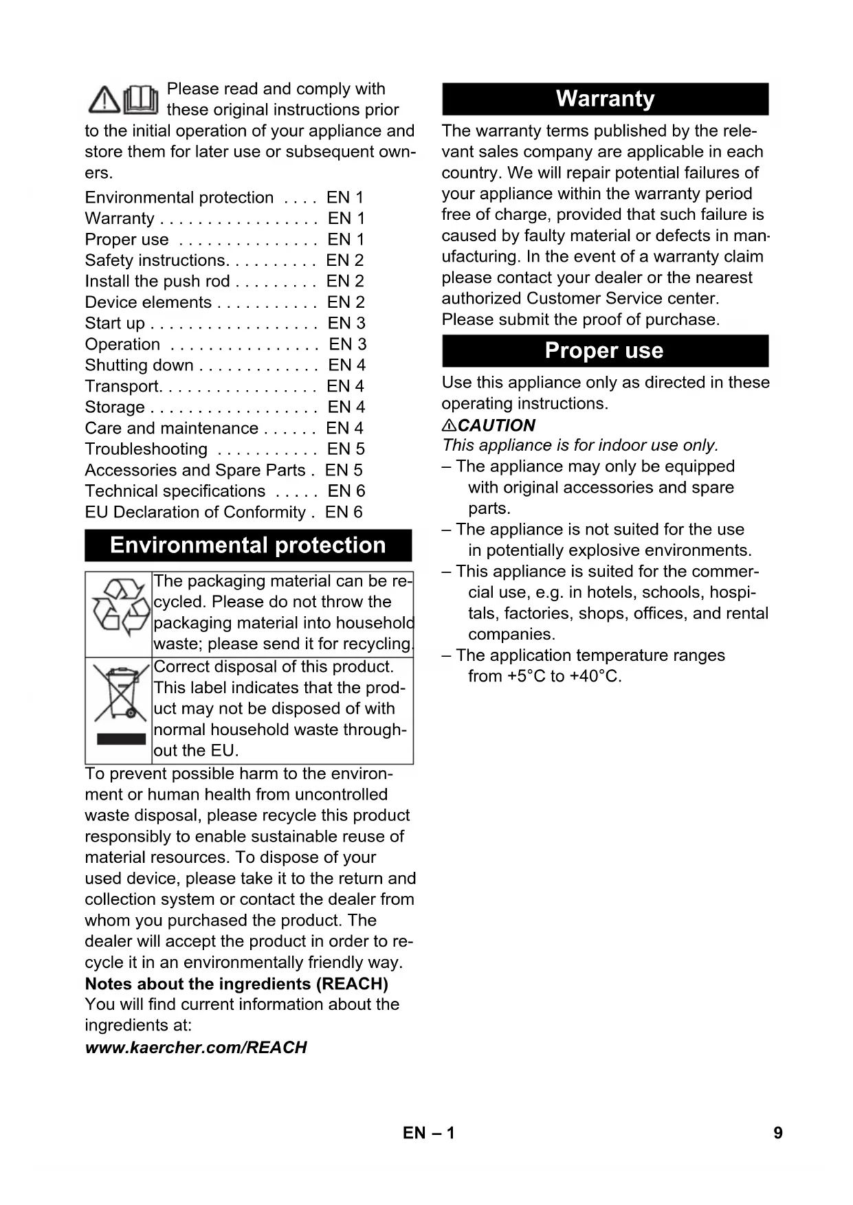 Chairman of the Board of Management Director Regulatory Affairs & Certification 8 DE– 1 Please read and comply with these original instructions prior to the initial operation of your appliance and store them for later use or subsequent own- ers. To prevent possible harm to the environ- ment or human health from uncontrolled waste disposal, please recycle this product responsibly to enable sustainable reuse of material resources. To dispose of your used device, please take it to the return and collection system or contact the dealer from whom you purchased the product. The dealer will accept the product in order to re- cycle it in an environmentally friendly way. Notes about the ingredients (REACH) You will find current information about the ingredients at: www.kaercher.com/REACH The warranty terms published by the rele- vant sales company are applicable in each country. We will repair potential failures of your appliance within the warranty period free of charge, provided that such failure is caused by faulty material or defects in man- ufacturing. In the event of a warranty claim please contact your dealer or the nearest authorized Customer Service center. Please submit the proof of purchase. Use this appliance only as directed in these operating instructions. 몇 CAUTION This appliance is for indoor use only. – The appliance may only be equipped with original accessories and spare parts. – The appliance is not suited for the use in potentially explosive environments. – This appliance is suited for the commer- cial use, e.g. in hotels, schools, hospi- tals, factories, shops, offices, and rental companies. – The application temperature ranges from +5°C to +40°C. Environmental protection . . . . EN 1 Warranty . . . . . . . . . . . . . . . . . EN 1 Proper use . . . . . . . . . . . . . . . EN 1 Safety instructions. . . . . . . . . . EN 2 Install the push rod . . . . . . . . . EN 2 Device elements . . . . . . . . . . . EN 2 Start up . . . . . . . . . . . . . . . . . . EN 3 Operation . . . . . . . . . . . . . . . . EN 3 Shutting down . . . . . . . . . . . . . EN 4 Transport. . . . . . . . . . . . . . . . . EN 4 Storage . . . . . . . . . . . . . . . . . . EN 4 Care and maintenance . . . . . . EN 4 Troubleshooting . . . . . . . . . . . EN 5 Accessories and Spare Parts . EN 5 Technical specifications . . . . . EN 6 EU Declaration of Conformity . EN 6 Environmental protection The packaging material can be re- cycled. Please do not throw the packaging material into household waste; please send it for recycling. Correct disposal of this product. This label indicates that the prod- uct may not be disposed of with normal household waste through- out the EU. Warranty Proper use 9EN– 2 Before using the appliance for the first time, read and observe these operating instruc- tions and the accompanying brochure: Safety information for Disc single-pulley machine machines No. 5.956-659.0. DANGER Pointer to immediate danger, which leads to severe injuries or death. 몇 WARNING Pointer to a possibly dangerous situation, which can lead to severe injuries or death. 몇 CAUTION Pointer to a possibly dangerous situation, which can lead to minor injuries. ATTENTION Pointer to a possibly dangerous situation, which can lead to property damage. Safety devices serve to protect the user and must not be rendered in operational or their functions bypassed. Prevents the device from switching on un- intentionally. To switch on the device, press the unlocking button, then the ON/OFF switch. Prior to operation, the push rod must be in- stalled as shown and the appliance has to be connected to power. Illustration on the inside of the front cover The device illustration shows the BDS 43/ 150 C Classic device. The BDS 43/Duo C device differs slightly from this. 1 Actuator, disc brush / pad driver plate 2 Brush / pad driver plate 3 Dosing lever for detergent solution (op- tion) 4 Switch ON / OFF 5 Cable hook 6 Unlocking button 7 Handle 8 Lever for level adjustment 9 Fuse for brush drive 10 Socket for accessories 11 Detergent tank (option) 12 Motor casing 13 Brush speed switch (BDS 43/Duo C on- ly) ** not included in the scope of delivery Safety instructions Hazard levels Safety Devices Lock Install the push rod Device elements