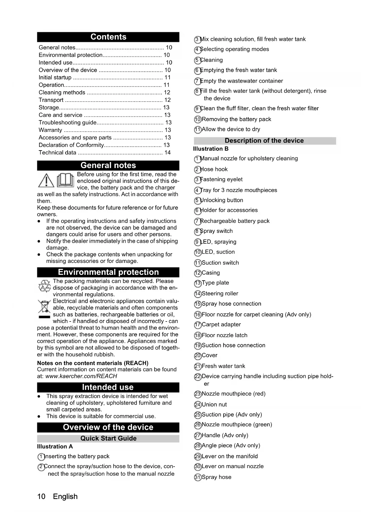 0,210 English Contents General notes Before using for the first time, read the enclosed original instructions of this de- vice, the battery pack and the charger as well as the safety instructions. Act in accordance with them. Keep these documents for future reference or for future owners. ● If the operating instructions and safety instructions are not observed, the device can be damaged and dangers could arise for users and other persons. ● Notify the dealer immediately in the case of shipping damage. ● Check the package contents when unpacking for missing accessories or for damage. Environmental protection The packing materials can be recycled. Please dispose of packaging in accordance with the en- vironmental regulations. Electrical and electronic appliances contain valu- able, recyclable materials and often components such as batteries, rechargeable batteries or oil, which - if handled or disposed of incorrectly - can pose a potential threat to human health and the environ- ment. However, these components are required for the correct operation of the appliance. Appliances marked by this symbol are not allowed to be disposed of togeth- er with the household rubbish. Notes on the content materials (REACH) Current information on content materials can be found at: www.kaercher.com/REACH Intended use ● This spray extraction device is intended for wet cleaning of upholstery, upholstered furniture and small carpeted areas. ● This device is suitable for commercial use. Overview of the device Quick Start Guide Illustration A 1 Inserting the battery pack 2 Connect the spray/suction hose to the device, con- nect the spray/suction hose to the manual nozzle 3 Mix cleaning solution, fill fresh water tank 4 Selecting operating modes 5 Cleaning 6 Emptying the fresh water tank 7 Empty the wastewater container 8 Fill the fresh water tank (without detergent), rinse the device 9 Clean the fluff filter, clean the fresh water filter 10 Removing the battery pack 11 Allow the device to dry Description of the device Illustration B 1 Manual nozzle for upholstery cleaning 2 Hose hook 3 Fastening eyelet 4 Tray for 3 nozzle mouthpieces 5 Unlocking button 6 Holder for accessories 7 Rechargeable battery pack 8 Spray switch 9 LED, spraying 10 LED, suction 11 Suction switch 12 Casing 13 Type plate 14 Steering roller 15 Spray hose connection 16 Floor nozzle for carpet cleaning (Adv only) 17 Carpet adapter 18 Floor nozzle latch 19 Suction hose connection 20 Cover 21 Fresh water tank 22 Device carrying handle including suction pipe hold-