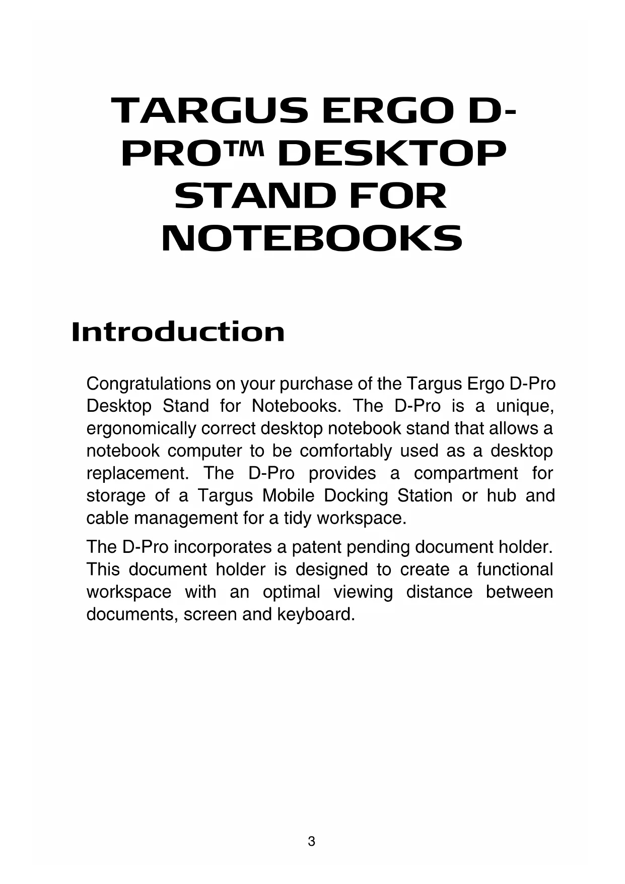 Congratulations on your purchase of the Targus Ergo D-Pro Desktop Stand for Notebooks. The D-Pro is a unique, ergonomically correct desktop notebook stand that allows a notebook computer to be comfortably used as a desktop replacement. The D-Pro provides a compartment for storage of a Targus Mobile Docking Station or hub and cable management for a tidy workspace.