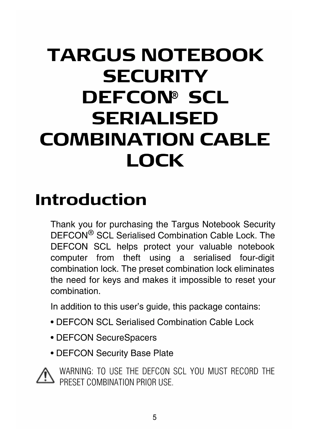 USING THE COMBINATION. TO DO SO WILL PHYSICALLY DAMAGE YOUR NOTEBOOK COMPUTER. 1 Using the dials, enter the correct combination. 2 The combination appears in the windows.11 Targus Notebook Security DEFCON® SCL Serialised Combination Cable Lock 3 Press and hold the locking button to realign the locking teeth. 4 Remove the DEFCON SCL from your notebook computer’s lock slot. DEFCON Security Base Plate Included with your DEFCON SCL Combo Cable Lock is the Security Base Plate for the security of desktop computers. Using the DEFCON Security Base Plate 1 Choose a solid location to attach the DEFCON Security Base Plate: a piece of furniture, or metal cabinet. If you plan to use the two screws, you can use the base plate as a template to pre-drill the holes. 2 Use the abrasive pad, then the alcohol wipe to prepare the area when you will attach the DEFCON Security Base Plate.12 Targus Notebook Security DEFCON® SCL Serialised Combination Cable Lock 3 After the alcohol dries, remove the backing on the base plate to expose the adhesive and place it on the prepared location. If desired, secure the base with the two screws. NOTE: W HEN USING THE ADHESIVE BACKING, APPLY AT ROOM TEMPERATURE -60°F (16°C), AND ALLOW IT TO BOND FOR MORE THAN 24 HOURS. NOT RECOMMENDED FOR USE OUTDOORS OR IN A HIGH HUMIDITY ENVIRONMENT.