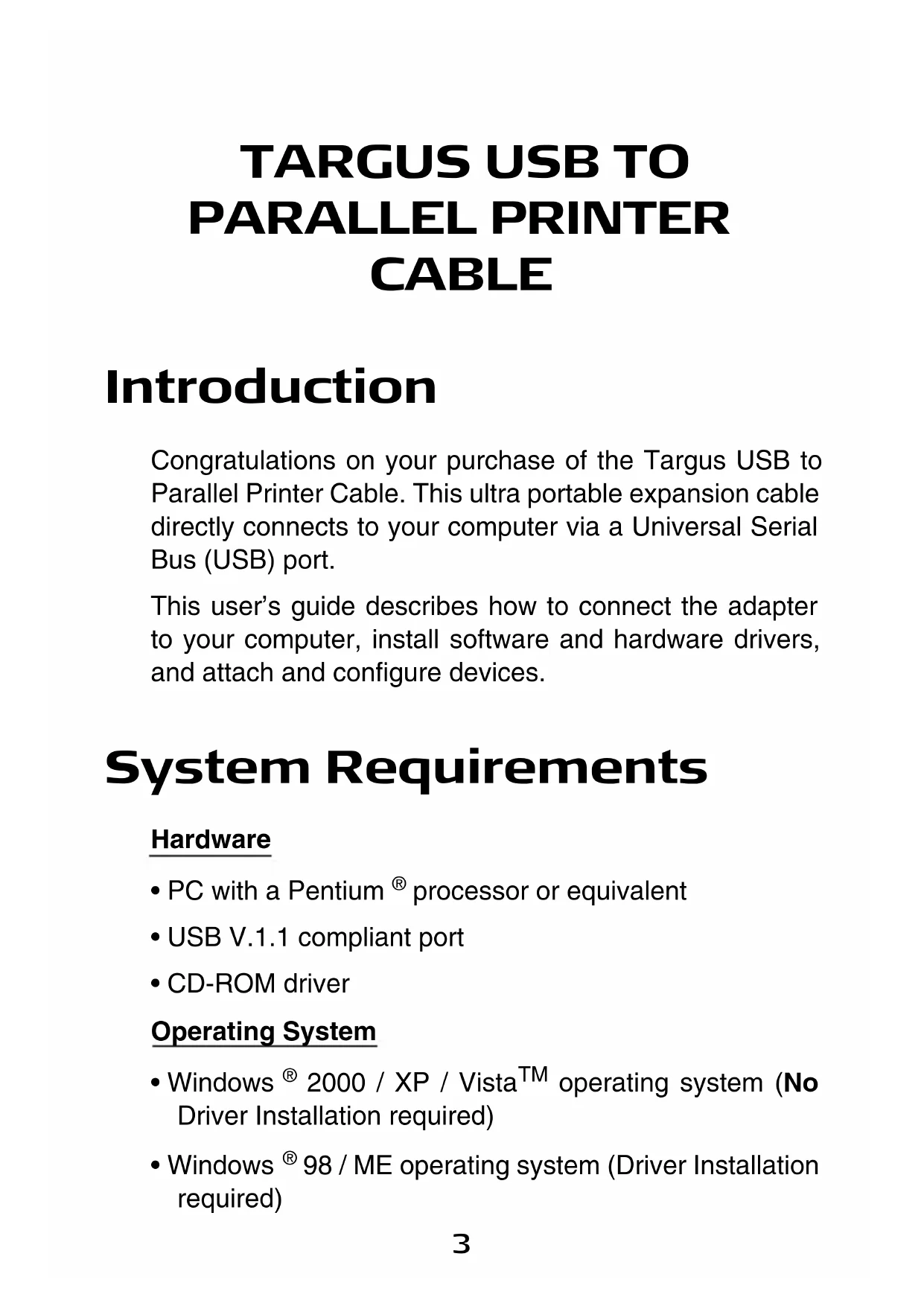 PARALLEL PRINTER CABLE Introduction Congratulations on your purchase of the Targus USB to Parallel Printer Cable. This ultra portable expansion cable directly connects to your computer via a Universal Serial Bus (USB) port. This user’s guide describes how to connect the adapter to your computer, install software and hardware drivers, and attach and configure devices. System Requirements Hardware