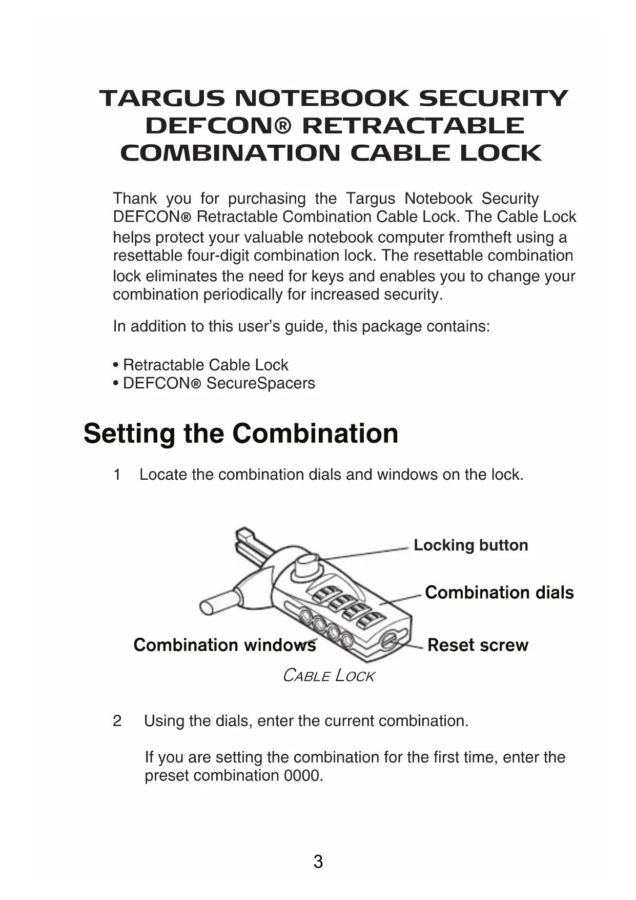 Thank you for purchasing the Targus Notebook Security DEFCON® Retractable Combination Cable Lock. The Cable Lock helps protect your valuable notebook computer fromtheft using a resettable four-digit combination lock. The resettable combination lock eliminates the need for keys and enables you to change your combination periodically for increased security.In addition to this user’s guide, this package contains:• Retractable Cable Lock• DEFCON® SecureSpacers1 Locate the combination dials and windows on the lock.Locking button2 Using the dials, enter the current combination.If you are setting the combination for the first time, enter the preset combination 0000.