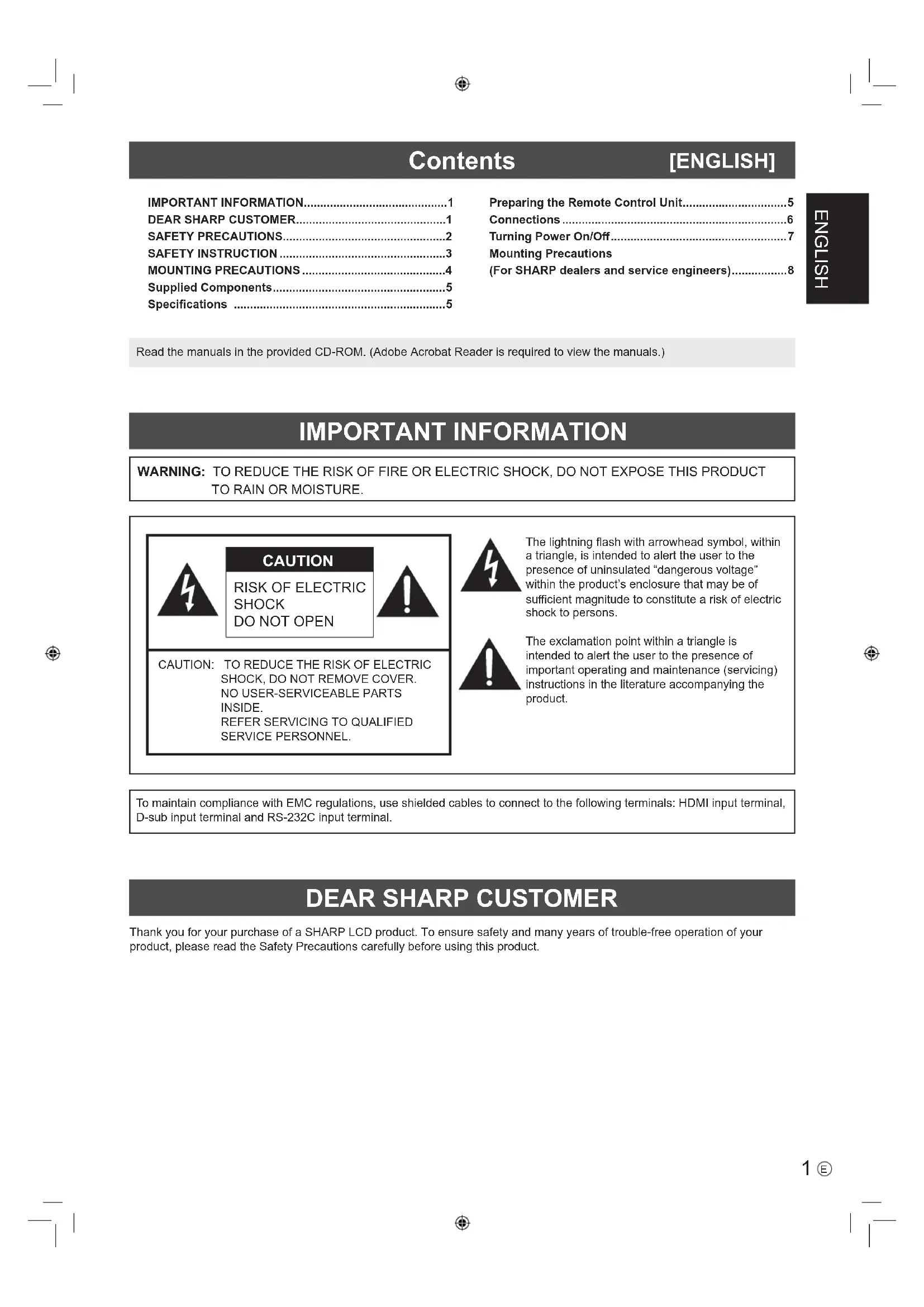 CAUTION CAUTION: TO REDUCE THE RISK OF ELECTRIC SHOCK, DO NOT REMOVE COVER. NO USER-SERVICEABLE PARTS INSIDE. REFER SERVICING TO QUALIFIED SERVICE PERSONNEL.The lightning ash with arrowhead symbol, within a triangle, is intended to alert the user to the presence of uninsulated “dangerous voltage” within the product’s enclosure that may be of sucient magnitude to constitute a risk of electric shock to persons.The exclamation point within a triangle is intended to alert the user to the presence of important operating and maintenance (servicing) instructions in the literature accompanying the product.Thank you for your purchase of a SHARP LCD product. To ensure safety and many years of trouble-free operation of your product, please read the Safety Precautions carefully before using this product.
