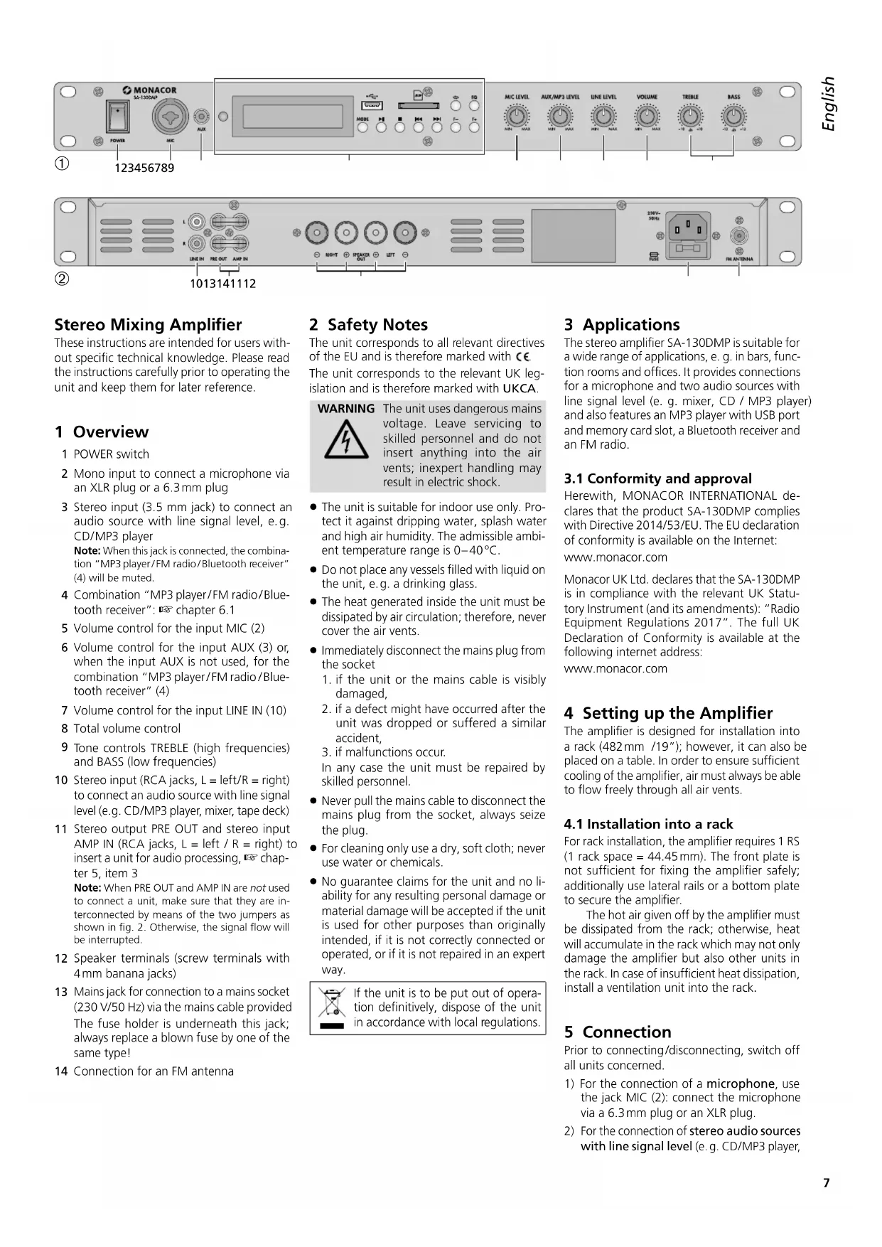 Herewith, MONACOR INTERNATIONAL de-clares that the product SA-130DMP complies with Directive 2014 / 53 / EU. The EU declaration of conformity is available on the Internet:www.monacor.comMonacor UK Ltd. declares that the SA-130DMP is in compliance with the relevant UK Statu-tory Instrument (and its amendments): “Radio Equipment Regulations 2017”. The full UK Declaration of Conformity is available at the following internet address:www.monacor.com 4 Setting up the Amplifier The amplifier is designed for installation into a rack (482 mm /19”); however, it can also be placed on a table. In order to ensure sufficient cooling of the amplifier, air must always be able to flow freely through all air vents.