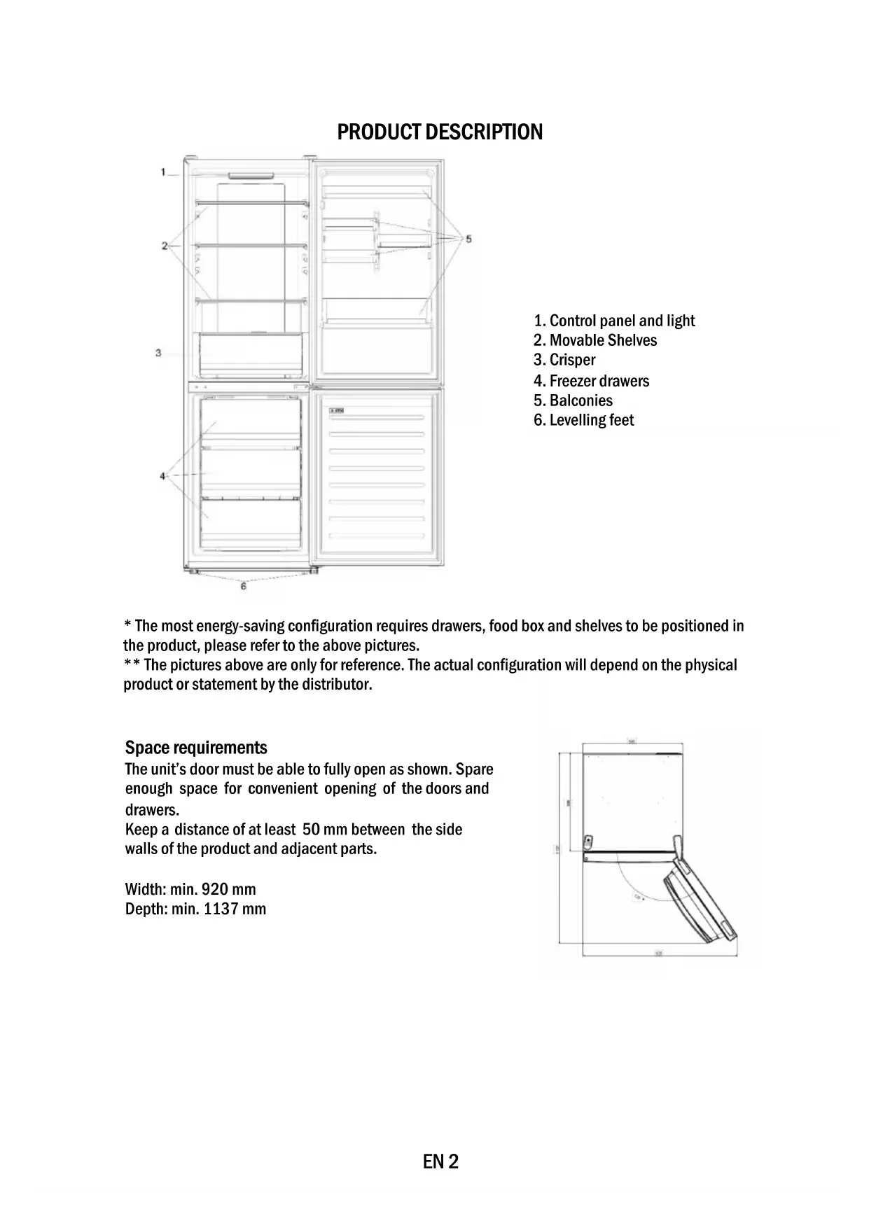 - The most energy-saving configuration requires drawers, food box and shelves to be positioned in the product, please refer to the above pictures. ** The pictures above are only for reference. The actual configuration will depend on the physical product or statement by the distributor. Space requirements The unit’s door must be able to fully open as shown. Spare enough space for convenient opening of the doors and drawers. Keep a distance of at least 50 mm between the side walls of the product and adjacent parts. Width: min. 920 mm Depth: min. 1137 mmEN 3 USE ➀ ON/OFF key, used to switch on/off the appliance. ➁ SET key, used to select the fridge temperature or the special functions like. ➂ WiFi Icon, shows if the appliance is connected to the app. ➃ Super Cool Icon, shows if the function is activated. ➄ Temperature levels, show which is the selected temperature. Use