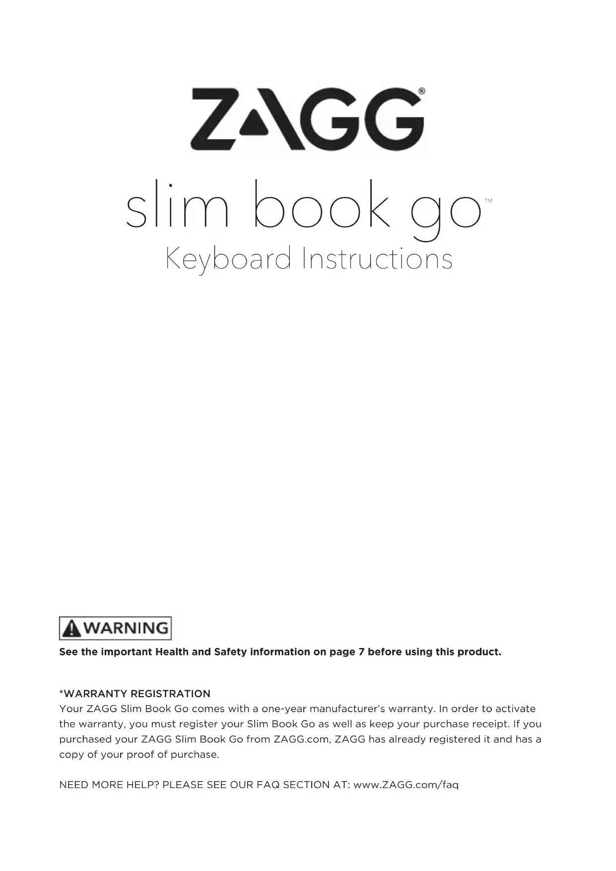 *WARRANTY REGISTRATION Your ZAGG Slim Book Go comes with a one-year manufacturer’s warranty. In order to activate the warranty, you must register your Slim Book Go as well as keep your purchase receipt. If you purchased your ZAGG Slim Book Go from ZAGG.com, ZAGG has already registered it and has a copy of your proof of purchase. NEED MORE HELP? PLEASE SEE OUR FAQ SECTION AT: www.ZAGG.com/faq See the important Health and Safety information on page 7 before using this product.INSERTING/REMOVING YOUR DEVICE