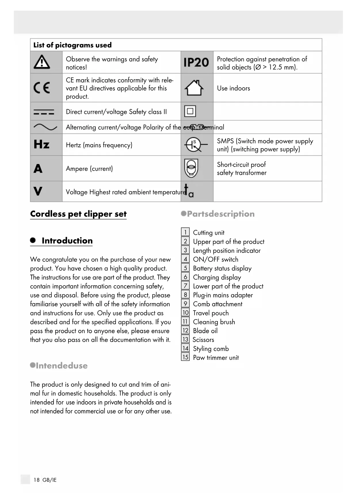 Voltage Highest rated ambient temperature Cordless pet clipper set Introduction We congratulate you on the purchase of your new product. You have chosen a high quality product. The instructions for use are part of the product. They contain important information concerning safety, use and disposal. Before using the product, please familiarise yourself with all of the safety information and instructions for use. Only use the product as described and for the specified applications. If you pass the product on to anyone else, please ensure that you also pass on all the documentation with it. Intended use The product is only designed to cut and trim of ani- mal fur in domestic households. The product is only intended for use indoors in private households and is not intended for commercial use or for any other use. Parts description