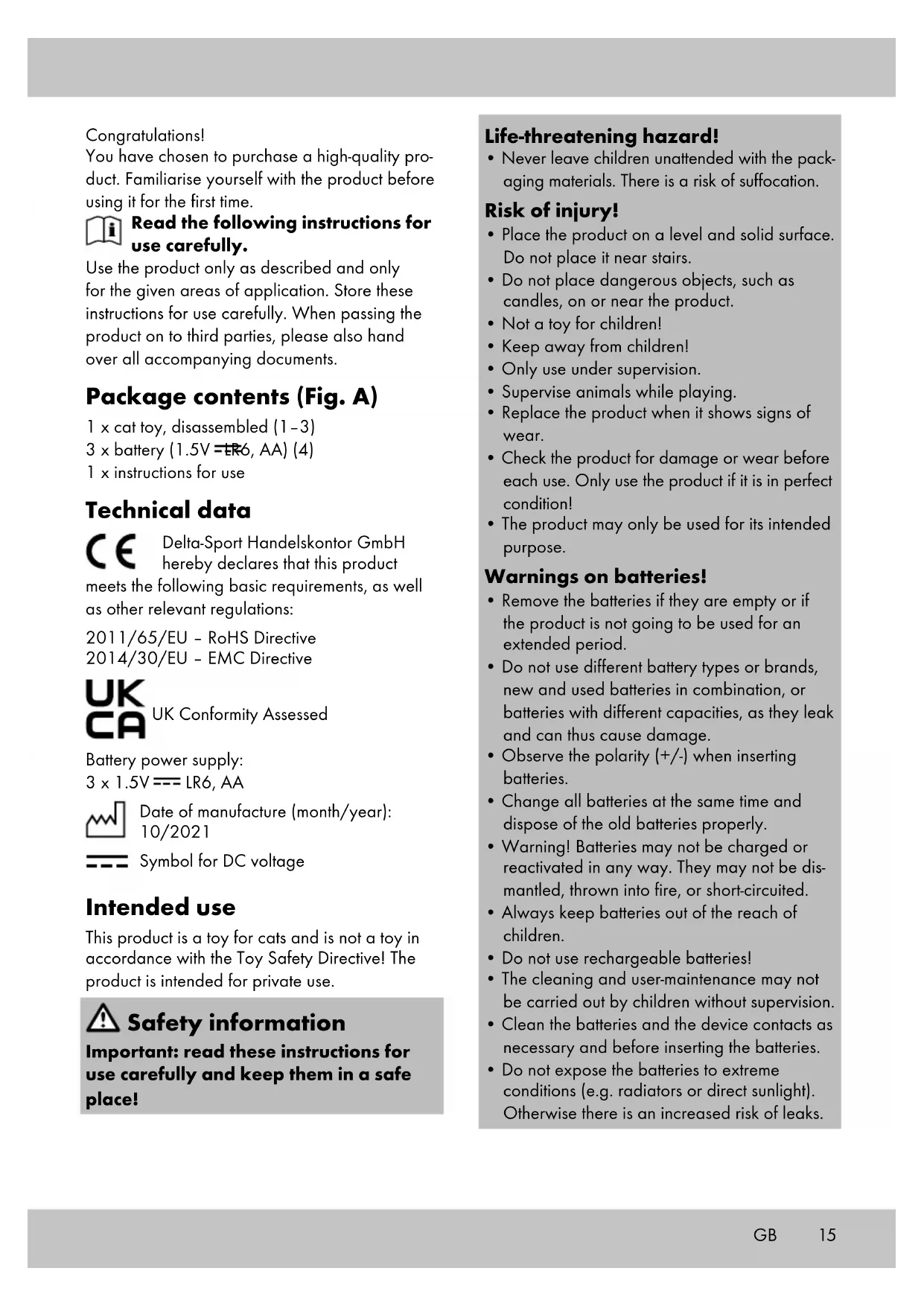 This product is a toy for cats and is not a toy in accordance with the Toy Safety Directive! The product is intended for private use.