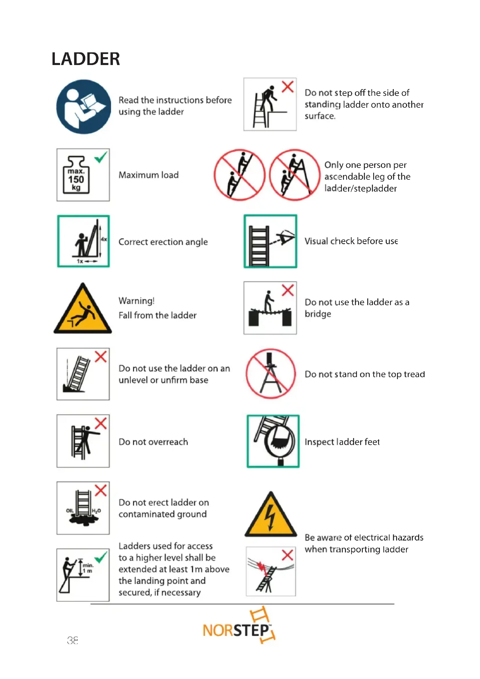 Repairs and maintenance shall be carried out by a competent person and be in accordance with the producer’s instruction. For repair and replacement of parts, e.g. feet, if necessary contact the producer or distributor. Ladders should be stored in accordance with the producer’s instructions. Ladders made of or using thermoplastic, thermosetting plastic and reinforced plastic materials should be stored out of direct sunlight. The important considerations when storing a ladder (not in use) should include the following: - Is the ladder stored away from areas where its condition could deteriorate more rapidly (e.g. dampness, excessive heat, or exposed to the elements)? - Is the ladder stored in a position which helps it to remain straight (e.g. hung by the stiles on proper ladder brackets or laid on a fl at clutter free surface)? - Is the ladder stored where it cannot be damaged by vehicles, heavy objects, or contaminants? - Is the ladder stored where it cannot cause a trip hazard or an obstruction? - Is the ladder stored securely where it cannot be easily used for criminal purposes? - If the ladder is permanently positioned (e.g. on scaff olding), is it secured against unauthorized climbing (e.g. by children)?44 Maintaining and storing your ladder Keep the ladder in a clean, dry place. Hold the ladder fi rmly when carrying it. Never store materials on your ladder. Keep your ladder clean and free from any foreign matter. Clean the ladder after each use. Regularly check the parts and hinges of the ladder. Oil the hinges regularly but do so carefully to ensure no oil drips on the rungs or side rails. For regular inspection, the following items shall be taken into account: - check that the stiles/legs (uprights) are not bent, bowed, twisted, dented, cracked, corroded or rotten; - check that the stiles/legs around the fi xing points for other components are in good condition; - check that fi xings (usually rivets, screws or bolts) are not missing, loose, or corroded; - check that rungs/steps are not missing, loose, excessively worn, corroded or damaged; - check that the hinges between front and rear sections are not damaged, loose or corroded; - check that the locking stays horizontal, back rails and corner braces are not missing, bent, loose, corroded or damaged; - check that the rung hooks are not missing, damaged, loose or corroded and engage properly on the rungs; - check that guide brackets are not missing, damaged, loose or corroded and engage properly on the mating stile; - check that rubber feet / end caps are not missing, loose, excessively worn, corroded or damaged; - check that the entire ladder is free from contaminants (e.g. dirt, mud, paint, oil or grease); - check that locking catches (if fi tted) are not damaged or corroded and function correctly; - check that the platform (if fi tted) has no missing parts or fi xings and is not damaged or corroded. If any of the above checks cannot be fully satisfi ed, you should NOT use the ladder.45