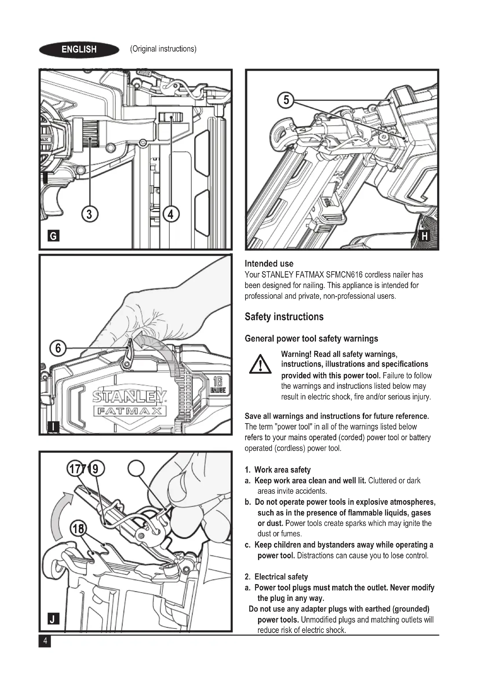 Intended use Your STANLEY FATMAX SFMCN616 cordless nailer has been designed for nailing. This appliance is intended for professional and private, non-professional users. Safety instructions General power tool safety warnings