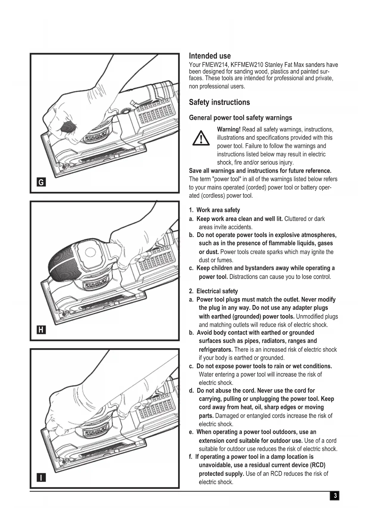 Intended use Your FMEW214, KFFMEW210 Stanley Fat Max sanders have been designed for sanding wood, plastics and painted sur- faces. These tools are intended for professional and private, non professional users. Safety instructions General power tool safety warnings