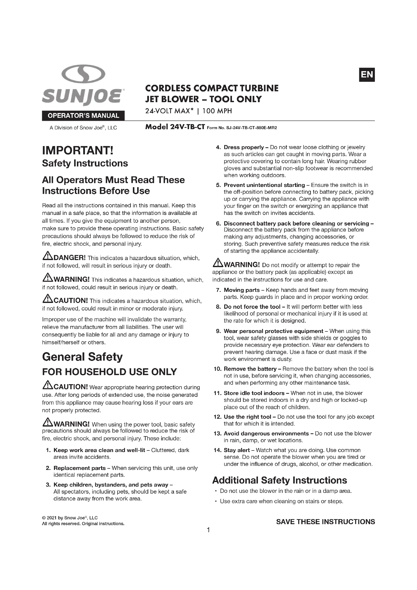 - Manual with registration card NOTE: In order to operate this cordless jet blower you will need 24V iON+ System batteries and chargers. See page 12 for battery options and specications, or visit sunjoe.com.