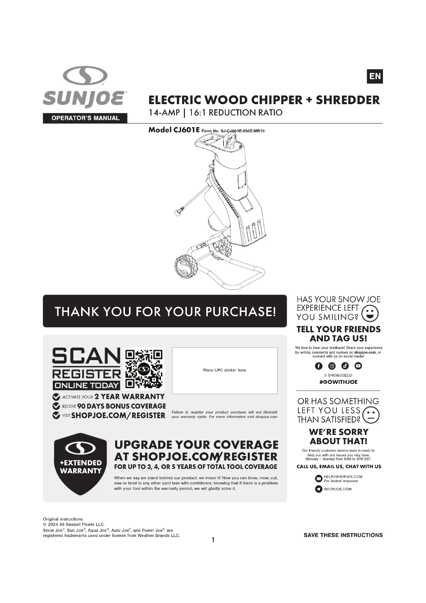 SHOPJOE.COM/REGISTERTELL YOUR FRIENDS AND TAG US!We love to hear your feedback! Share your experience by writing comments and reviews on shopjoe.com, or connect with us on social media!HAS YOUR SNOW JOE EXPERIENCE LEFT YOU SMILING? #GOWITHJOE E Q OR HAS SOMETHING LEFT YOU LESS THAN SATISFIED?WE’RE SORRY ABOUT THAT!Our friendly customer service team is ready to help you with any issues you may have, Monday — Sunday from 9AM to 5PM EST CALL US, EMAIL US, CHAT WITH US