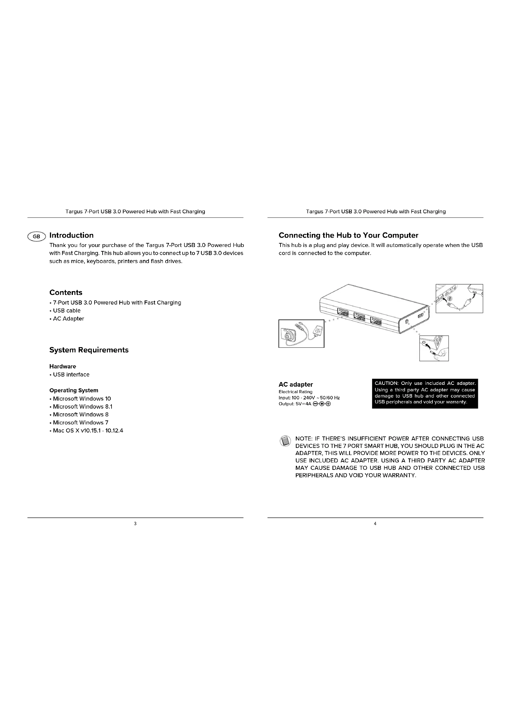 - Each USB port is equipped with over-current protection. When a USB device draw more current than the USB port can supply, the port will shut down. To re-enable the port, unplug the device and go to Device Manager or to the message in the system tray and choose the Reset option. You can then plug the device back into the USB port. If a shut down reoccurs, check the power requirements of the device. Verifying Devices are Installed You can view the devices installed on the 7-Port USB 3.0 Hub from the Device Manager window in System Properties. Right-click My Computer, Properties, then click the Hardware tab, and then the Device Manager button. Targus 7-Port USB 3.0 Powered Hub with Fast Charging Features Description Targus 7-Port USB 3.0 Powered Hub with Fast Charging USB 3.0 upstream port (connects to PC) Power connector for AC adapter USB 3.0 Ports USB 3.0 Fast Charging PortsUSB 3.0 Port USB 3.0 Port Front Side SideRear USB 3.0 Ports