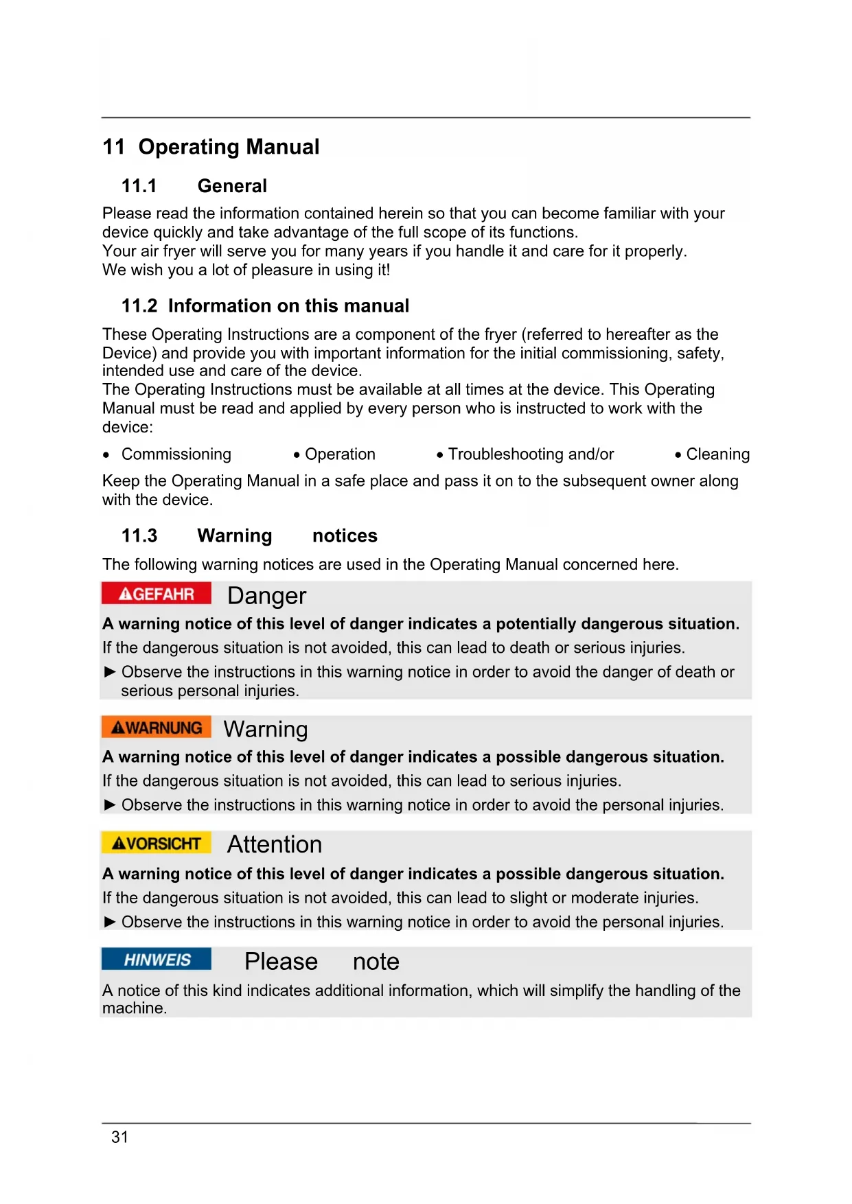 The following warning notices are used in the Operating Manual concerned here. Danger A warning notice of this level of danger indicates a potentially dangerous situation. If the dangerous situation is not avoided, this can lead to death or serious injuries. ► Observe the instructions in this warning notice in order to avoid the danger of death or serious personal injuries. Warning A warning notice of this level of danger indicates a possible dangerous situation. If the dangerous situation is not avoided, this can lead to serious injuries. ► Observe the instructions in this warning notice in order to avoid the personal injuries. Attention A warning notice of this level of danger indicates a possible dangerous situation. If the dangerous situation is not avoided, this can lead to slight or moderate injuries. ► Observe the instructions in this warning notice in order to avoid the personal injuries. Please note A notice of this kind indicates additional information, which will simplify the handling of the machine.32