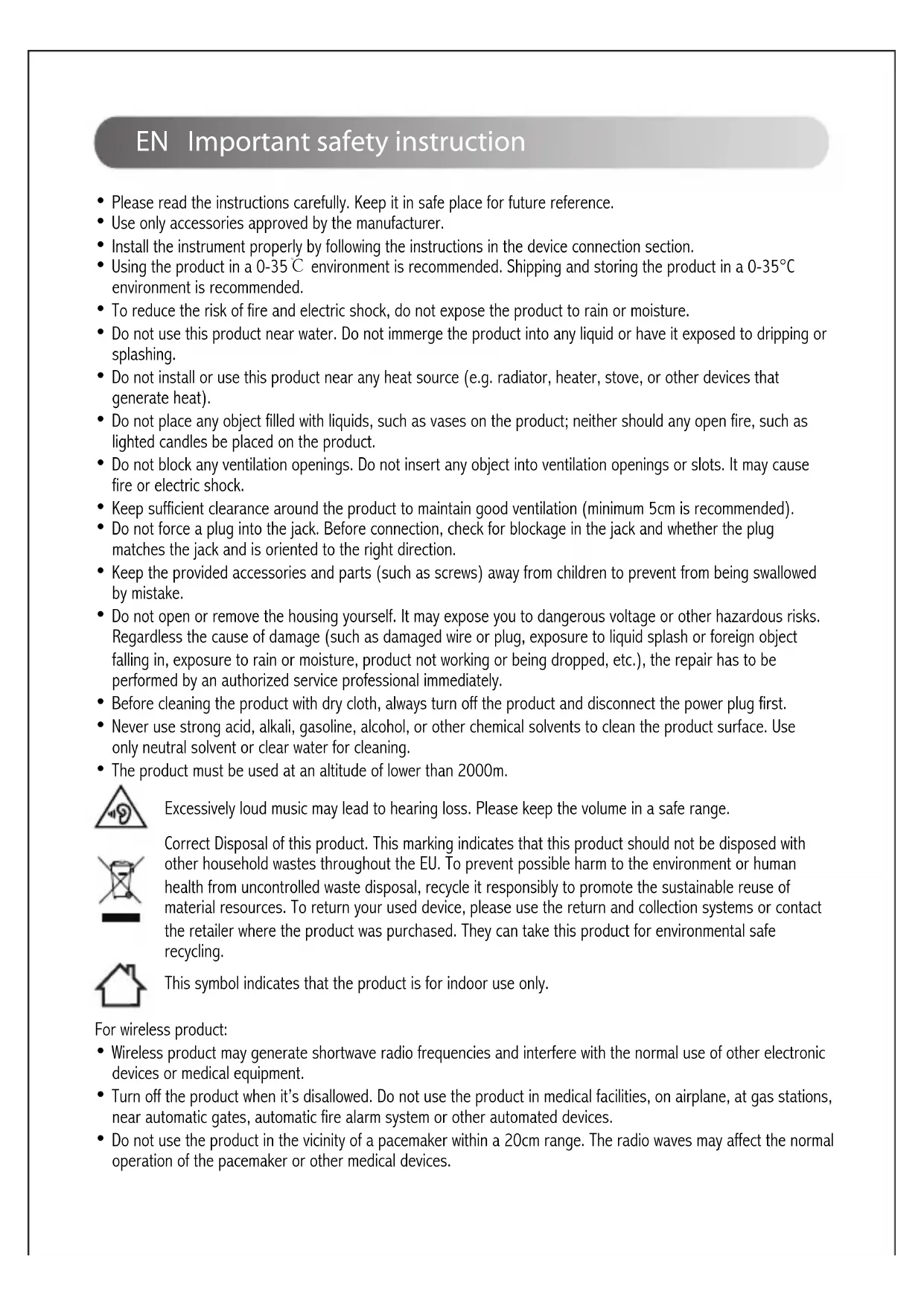 - The product must be used at an altitude of lower than 2000m. EN Important safety instruction For wireless product:
