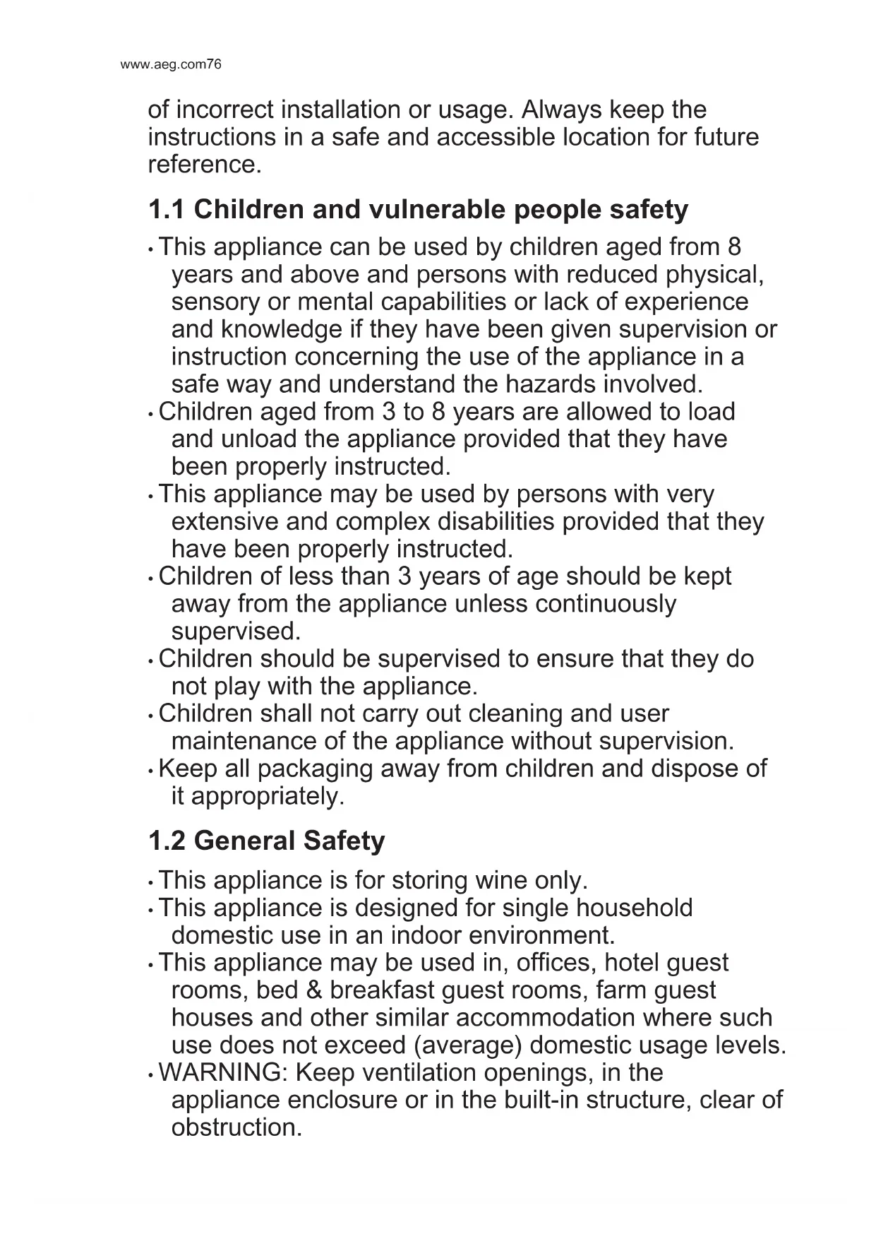 - WARNING: Keep ventilation openings, in the appliance enclosure or in the built-in structure, clear of obstruction. www.aeg.com76• WARNING: Do not use mechanical devices or other means to accelerate the defrosting process, other than those recommended by the manufacturer.