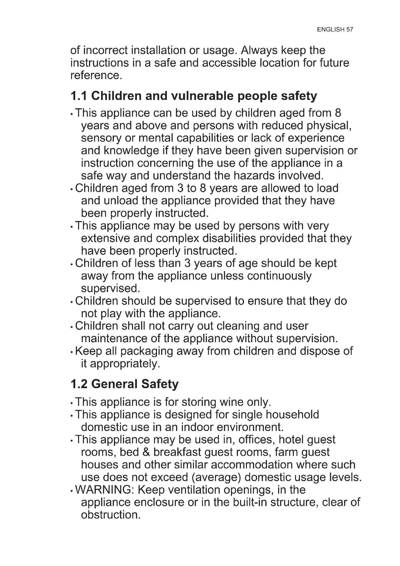 - WARNING: Keep ventilation openings, in the appliance enclosure or in the built-in structure, clear of obstruction. ENGLISH 57• WARNING: Do not use mechanical devices or other means to accelerate the defrosting process, other than those recommended by the manufacturer.