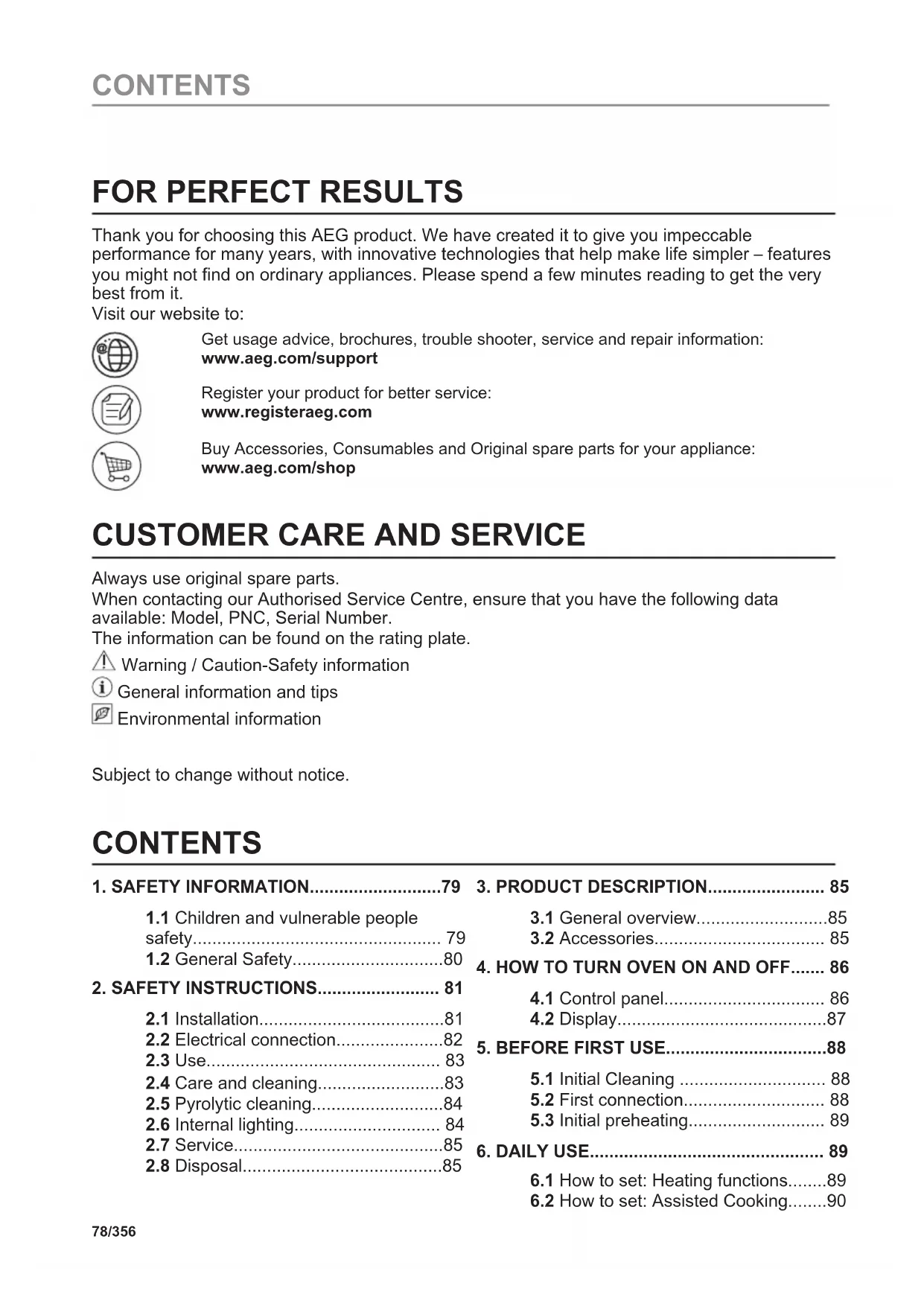 Always use original spare parts. When contacting our Authorised Service Centre, ensure that you have the following data available: Model, PNC, Serial Number. The information can be found on the rating plate. Warning / Caution-Safety information General information and tips Environmental information Subject to change without notice. CONTENTS