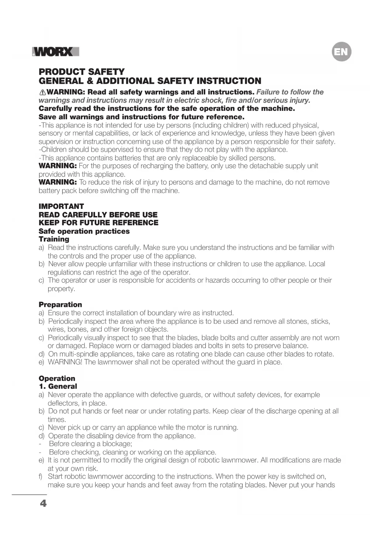 Safe operation practices Training a) Read the instructions carefully. Make sure you understand the instructions and be familiar with the controls and the proper use of the appliance. b) Never allow people unfamiliar with these instructions or children to use the appliance. Local regulations can restrict the age of the operator. c) The operator or user is responsible for accidents or hazards occurring to other people or their property. Preparation a) Ensure the correct installation of boundary wire as instructed. b) Periodically inspect the area where the appliance is to be used and remove all stones, sticks, wires, bones, and other foreign objects. c) Periodically visually inspect to see that the blades, blade bolts and cutter assembly are not worn or damaged. Replace worn or damaged blades and bolts in sets to preserve balance. d) On multi-spindle appliances, take care as rotating one blade can cause other blades to rotate. e) WARNING! The lawnmower shall not be operated without the guard in place. Operation