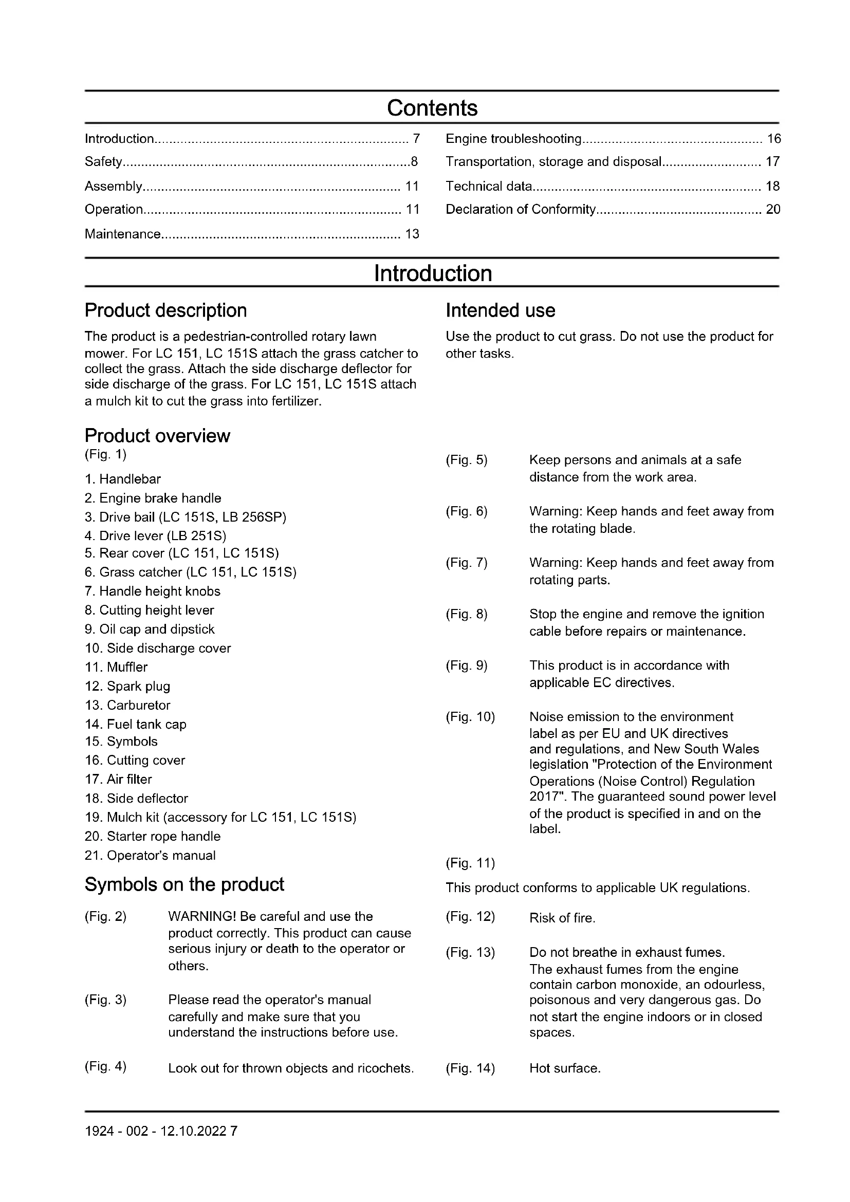 rotating parts. (Fig. 8) Stop the engine and remove the ignition cable before repairs or maintenance. (Fig. 9) This product is in accordance with applicable EC directives. (Fig. 10) Noise emission to the environment label as per EU and UK directives and regulations, and New South Wales legislation "Protection of the Environment Operations (Noise Control) Regulation 2017". The guaranteed sound power level of the product is specified in and on the label. (Fig. 11) This product conforms to applicable UK regulations. (Fig. 12) Risk of fire. (Fig. 13) Do not breathe in exhaust fumes. The exhaust fumes from the engine contain carbon monoxide, an odourless, poisonous and very dangerous gas. Do not start the engine indoors or in closed spaces. (Fig. 14) Hot surface. 1924 - 002 - 12.10.2022 7(Fig. 15) Fill the engine with oil before you start the product. Note: Other symbols/decals on the product refer to certification requirements for some commercial areas. Product liability As referred to in the product liability laws, we are not liable for damages that our product causes if: