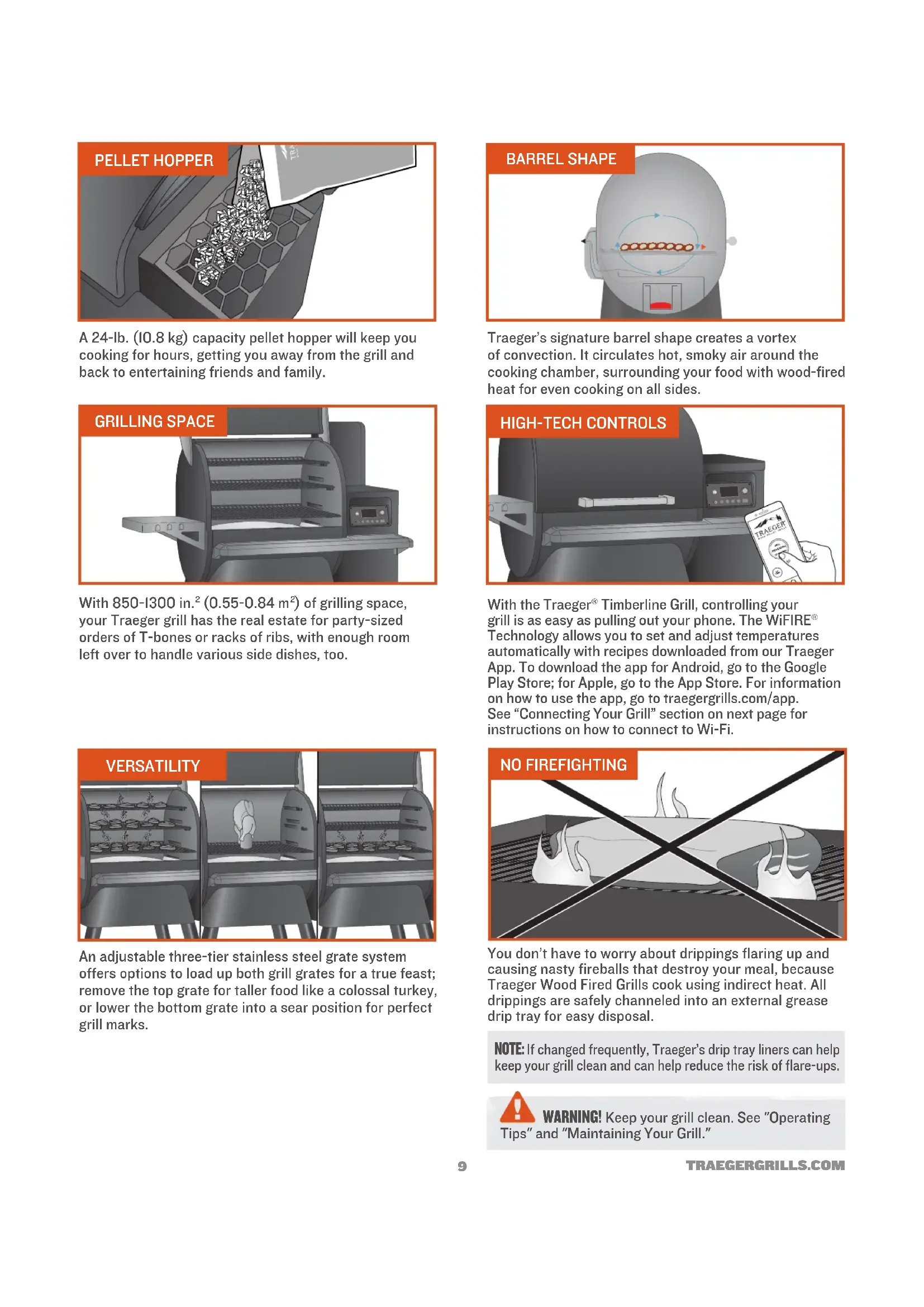 TRAEGERGRILLS.COM PELLET HOPPER GRILLING SPACE VERSATILITY NO FIREFIGHTING HIGH-TECH CONTROLS A 24-lb. (10.8 kg) capacity pellet hopper will keep you cooking for hours, getting you away from the grill and back to entertaining friends and family. Traeger’s signature barrel shape creates a vortex of convection. It circulates hot, smoky air around the cooking chamber, surrounding your food with wood-fired heat for even cooking on all sides. With 850-1300 in.