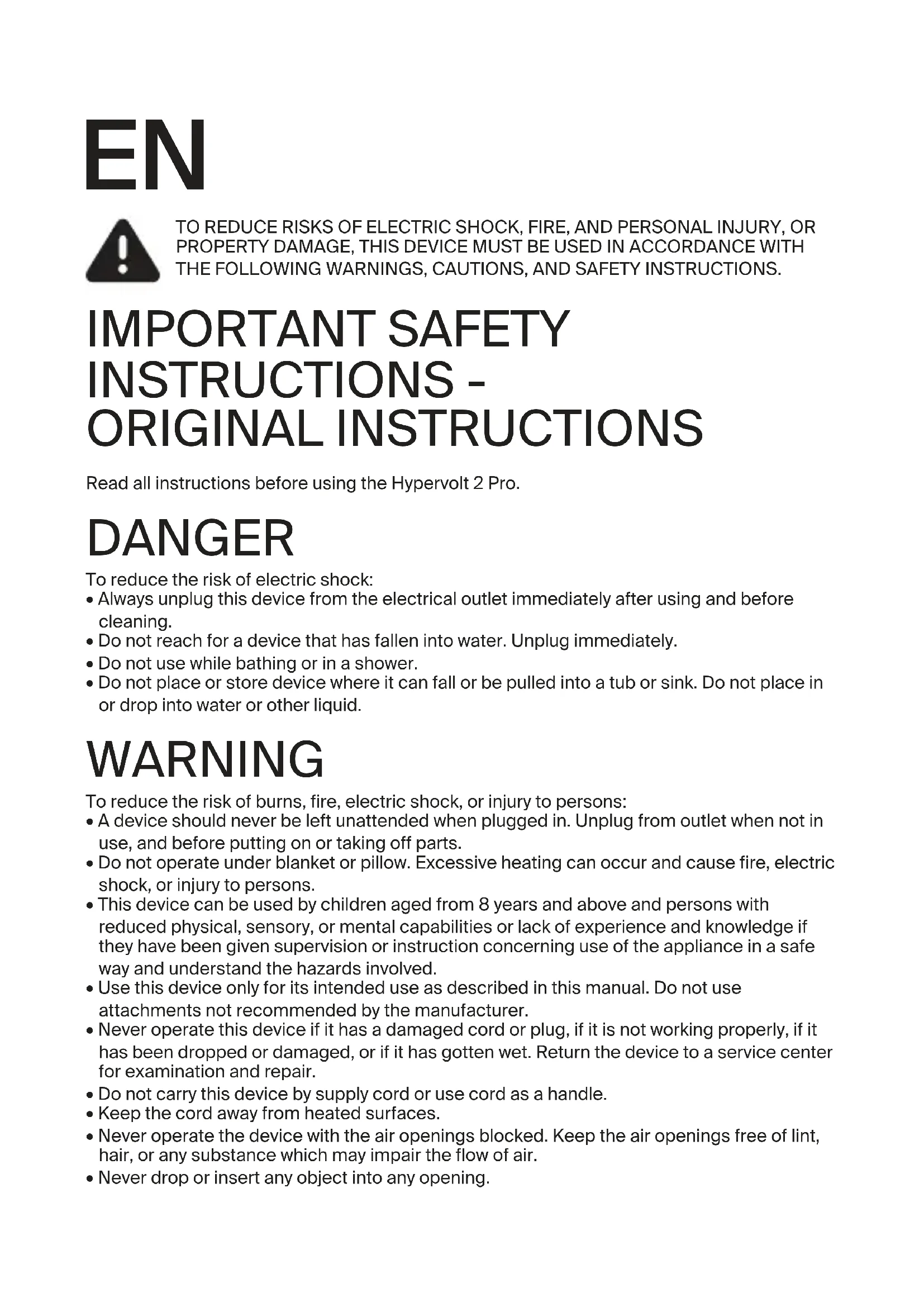 - Do not place or store device where it can fall or be pulled into a tub or sink. Do not place in or drop into water or other liquid. WARNING To reduce the risk of burns, fire, electric shock, or injury to persons: