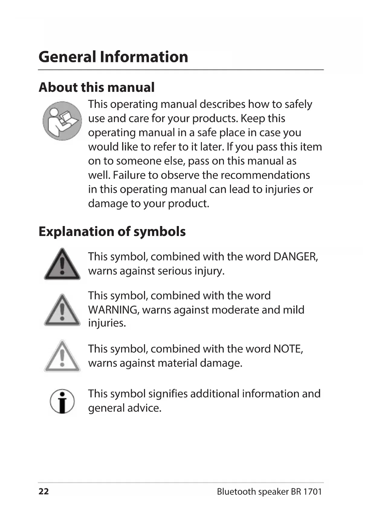 audio device.32 Bluetooth speaker BR 1701 Pay attention to the following: Use the button to mute the speaker. If you connect the audio cable to the speaker during audio playback via Bluetooth, it will switch automatically to the AUX input. In AUX mode, the phone function is disabled. The track control is carried out exclusively via the external audio device. Using the snap hook The snap hook can be used to carry the speaker on a belt loop. Do not use the snap hook for other purposes than intended! RESET function The device can stop responding due to electromagnetic radiation in the environment. − In this case, press and hold down the button for approx. 8 seconds to reset. After that, the speaker will respond again as usual. Cleaning − Clean the speaker with a slightly damp cloth and mild detergent. Make sure that no moisture penetrates the device.33 Bluetooth speaker BR 1701 English Fault/Remedy Fault Possible Cause No function. Charge the speaker battery, if necessary. If the battery is fully charged: Perform a RESET. No audio playback. Check whether playback has been interrupted (press