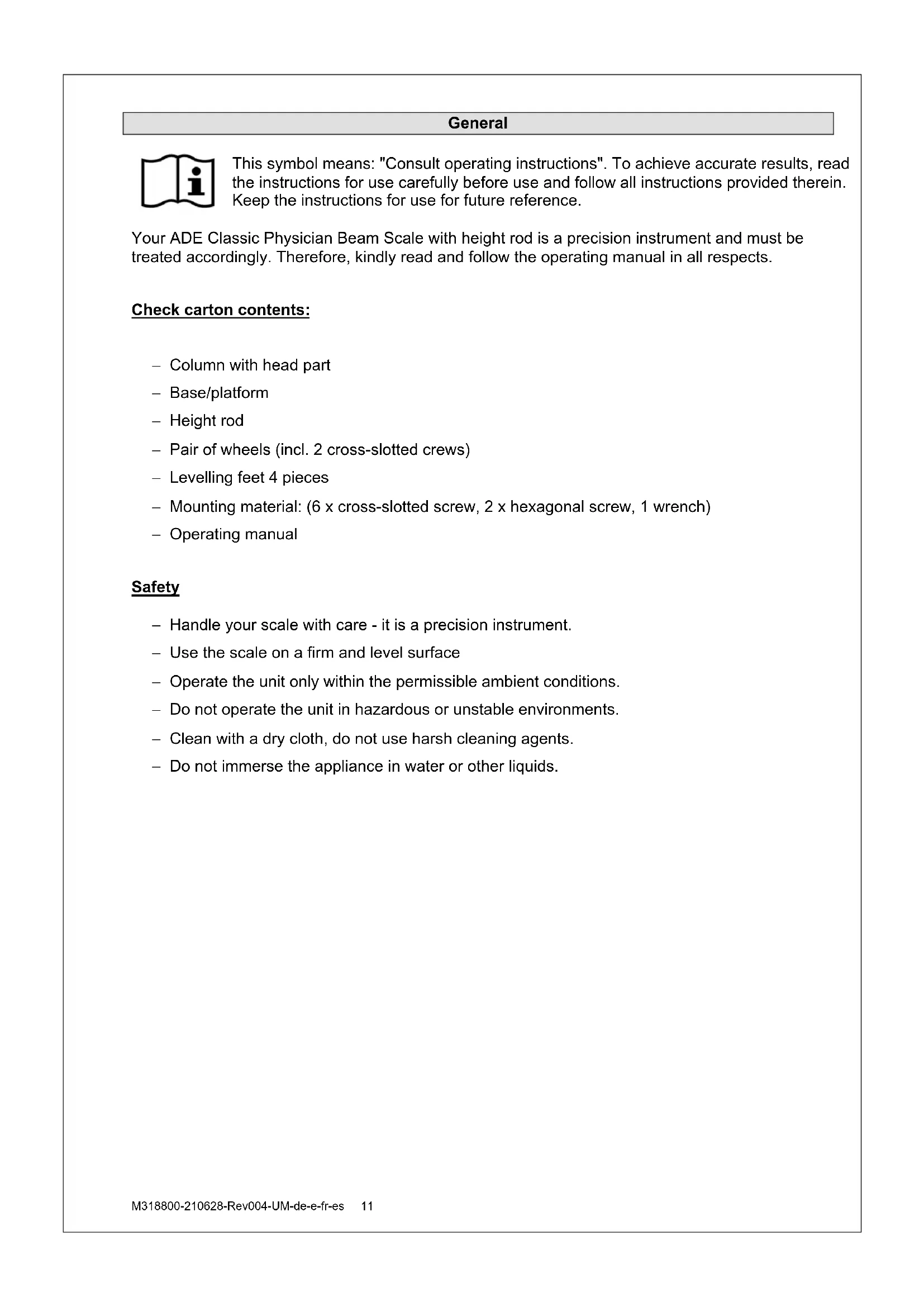 This symbol means: "Consult operating instructions". To achieve accurate results, read the instructions for use carefully before use and follow all instructions provided therein. Keep the instructions for use for future reference. Your ADE Classic Physician Beam Scale with height rod is a precision instrument and must be treated accordingly. Therefore, kindly read and follow the operating manual in all respects. Check carton contents: Column with head part Base/platform Height rod Pair of wheels (incl. 2 cross-slotted crews) Levelling feet 4 pieces Mounting material: (6 x cross-slotted screw, 2 x hexagonal screw, 1 wrench) Operating manual Safety Handle your scale with care - it is a precision instrument. Use the scale on a firm and level surface Operate the unit only within the permissible ambient conditions. Do not operate the unit in hazardous or unstable environments. Clean with a dry cloth, do not use harsh cleaning agents. Do not immerse the appliance in water or other liquids.12 M318800-210628-Rev004-UM-de-e-fr-es Assembling
