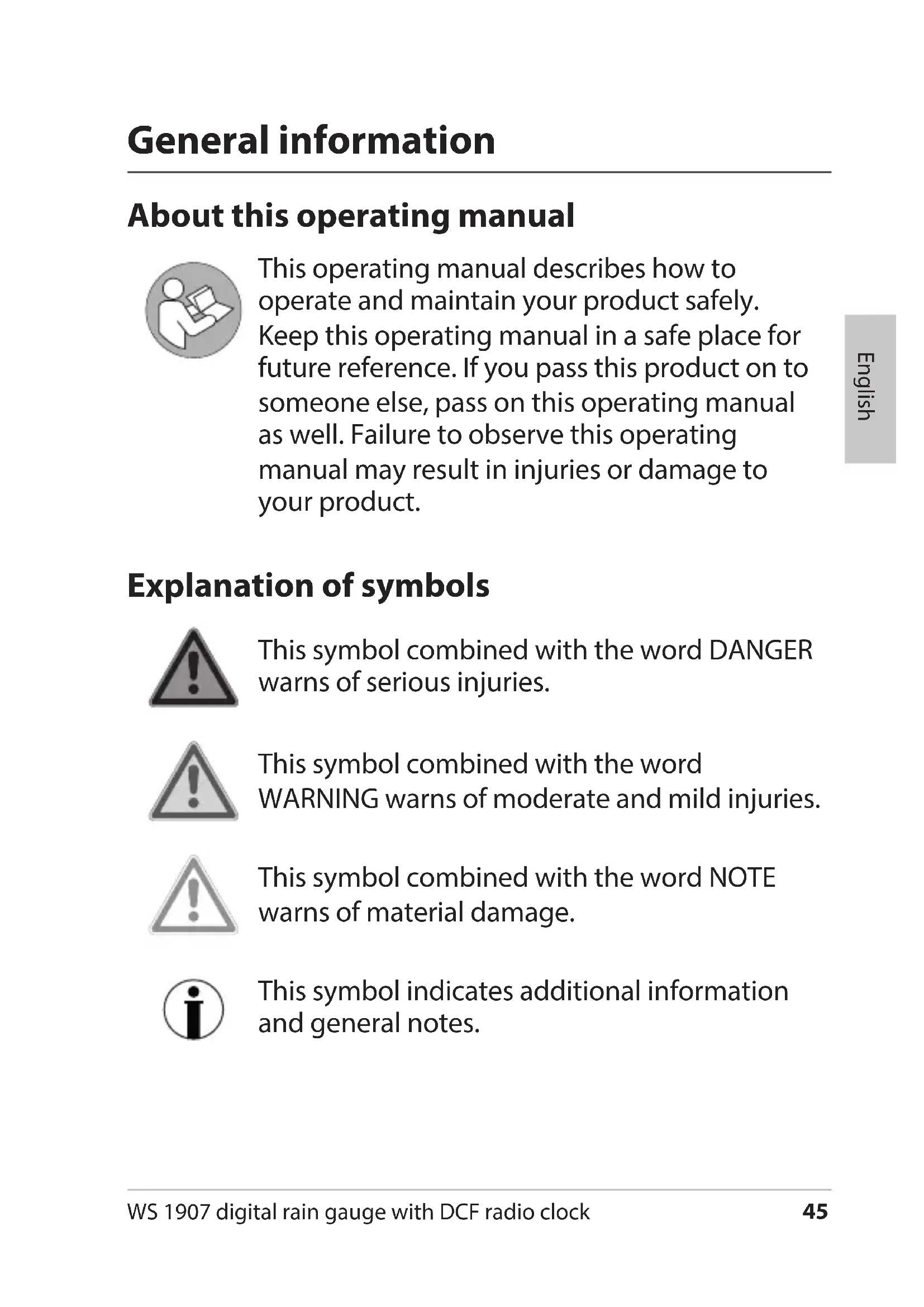 will be displayed.76 WS 1907 digital rain gauge with DCF radio clock The alarm signal will be muted for a few minutes based on the settings made (5 minutes by default). Then the device switches back on and the alarm sounds again. This procedure can be repeated multiple times. Other functions Turn on display lighting − Press the SNOOZE/LIGHT button to switch on the display light of the base station for approx. 15 seconds. Battery change indicator − Change the respective batteries when the battery replacement symbol is displayed in the IN (base station) or OUT (rain gauge) area. − Proceed as described in the chapter “Starting up”. Cleaning Base station − Wipe clean the base station with a slightly damp cloth, if necessary.77 WS 1907 digital rain gauge with DCF radio clock English Rain gauge