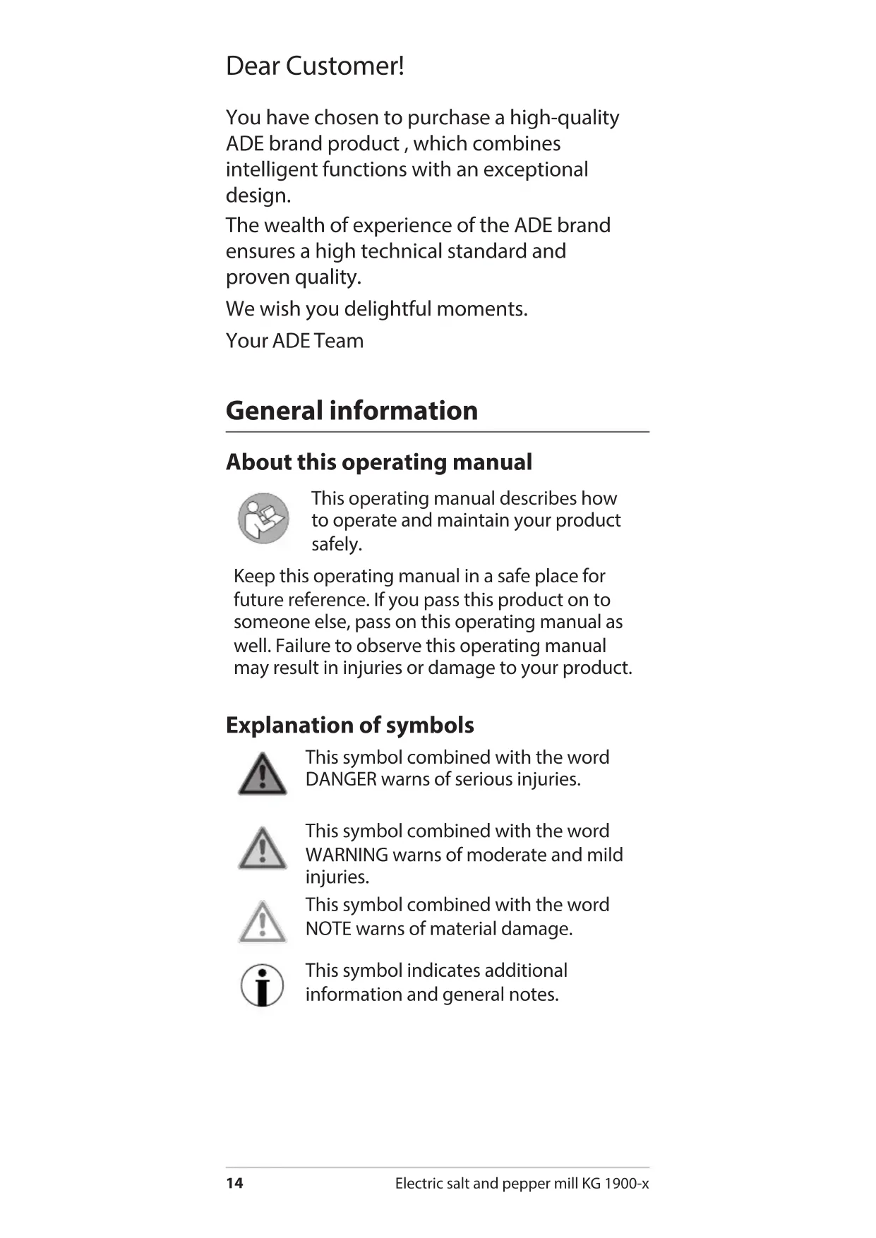 - Disposal Table of Contents16 Electric salt and pepper mill KG 1900-x Safety This product may be used by children aged8 and above, as well as by persons with reduced physical, sensory, or mental capacities or lacking experience and knowledge if they are supervised or have been instructed in the safe use of the product and understand the risks that may arise. Children must not play with the product. Cleaning and user maintenance must not be carried out by children, unless they are 8years of age or older and are being supervised. Batteries, when swallowed, can be life-threatening. You should therefore keep the item and batteries out of reach of children. If a battery has been swallowed, medical assistance must be sought immediately. DANGER for children Keep packaging material away from children. There is a risk of choking if swallowed. Also pay attention that children do not pull the packaging material over their heads.Electric salt and pepper mill KG 1900-x p. 24
