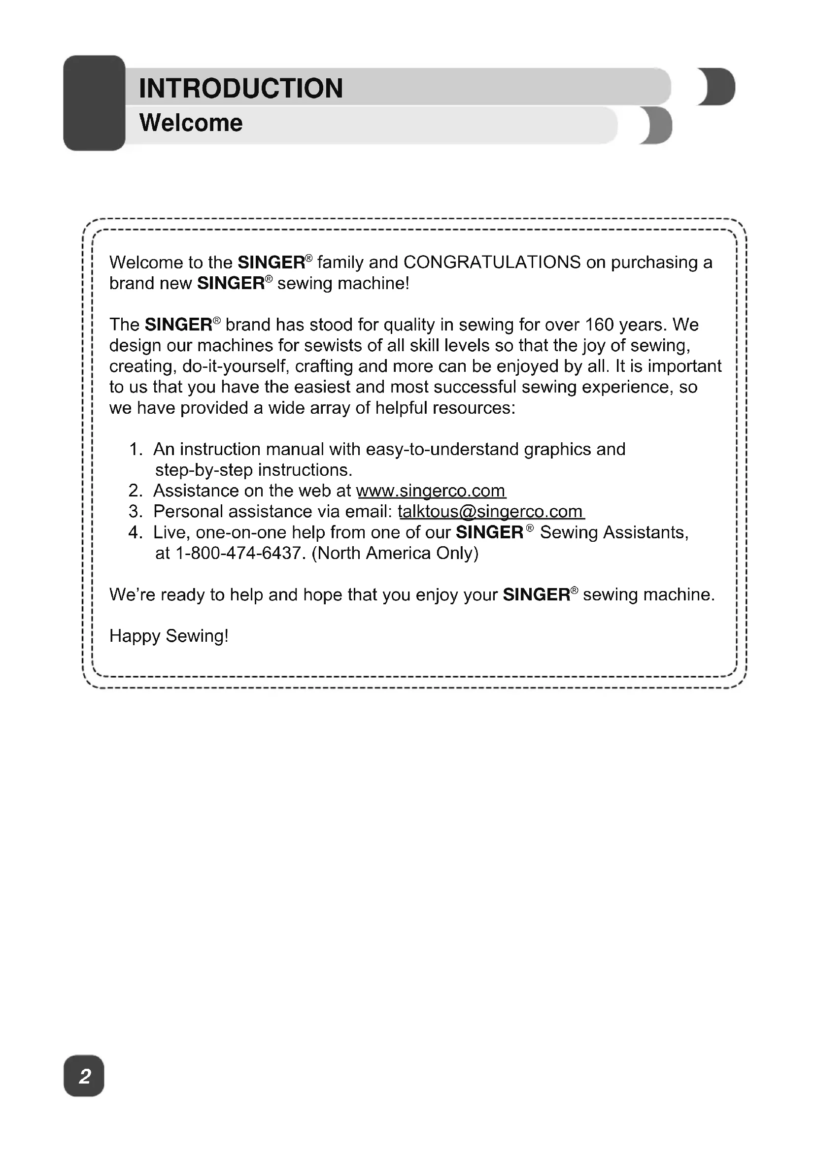 Sewing Assistants, at 1-800-474-6437. (North America Only) We’re ready to help and hope that you enjoy your SINGER