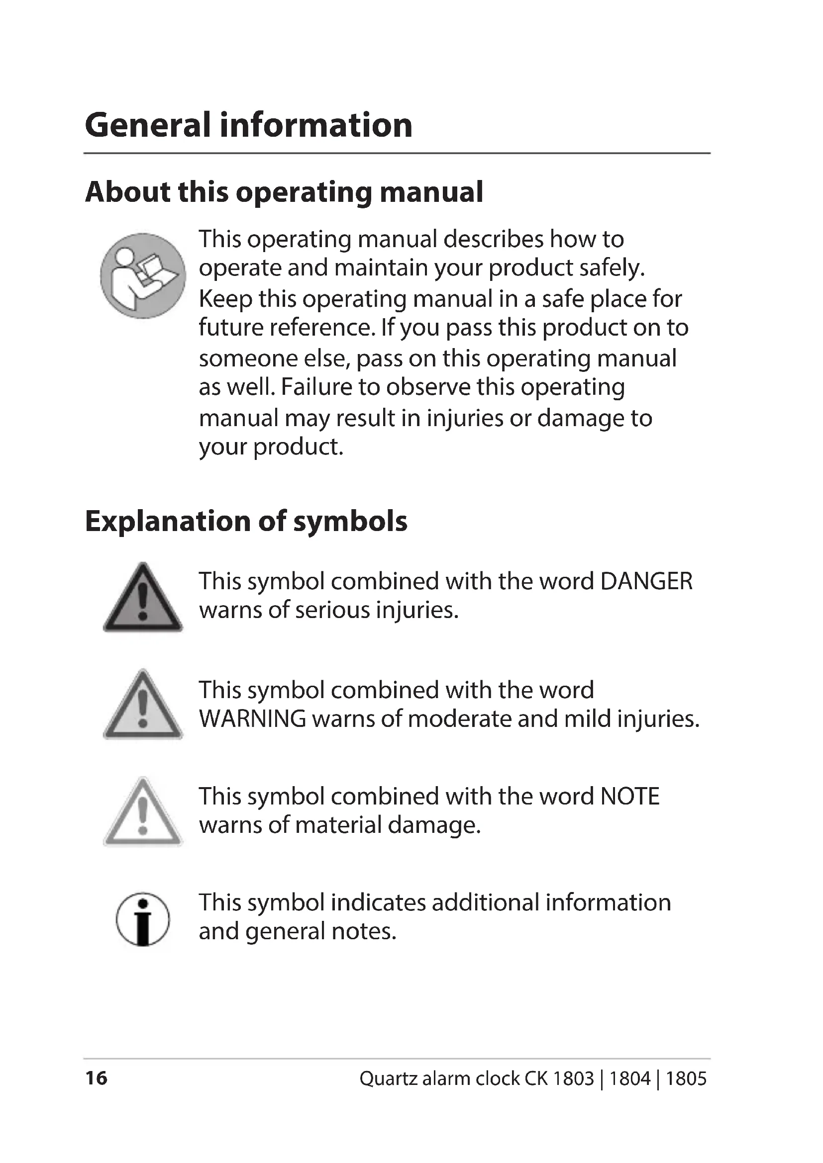 The locking tab must snap audibly into place.22 Quartz alarm clock CK 1803 | 1804 | 1805 Notes on changing the battery: When the hands stop, the batteries must be changed. Only use the battery type specied in the “Technical data”. Dispose of old batteries in an environmentally appropriate way (see “Disposal”). Setting the time − Use the time knob to set the time. Turn the knob only in the direction of the arrow shown. Alarm Setting and enabling the alarm time