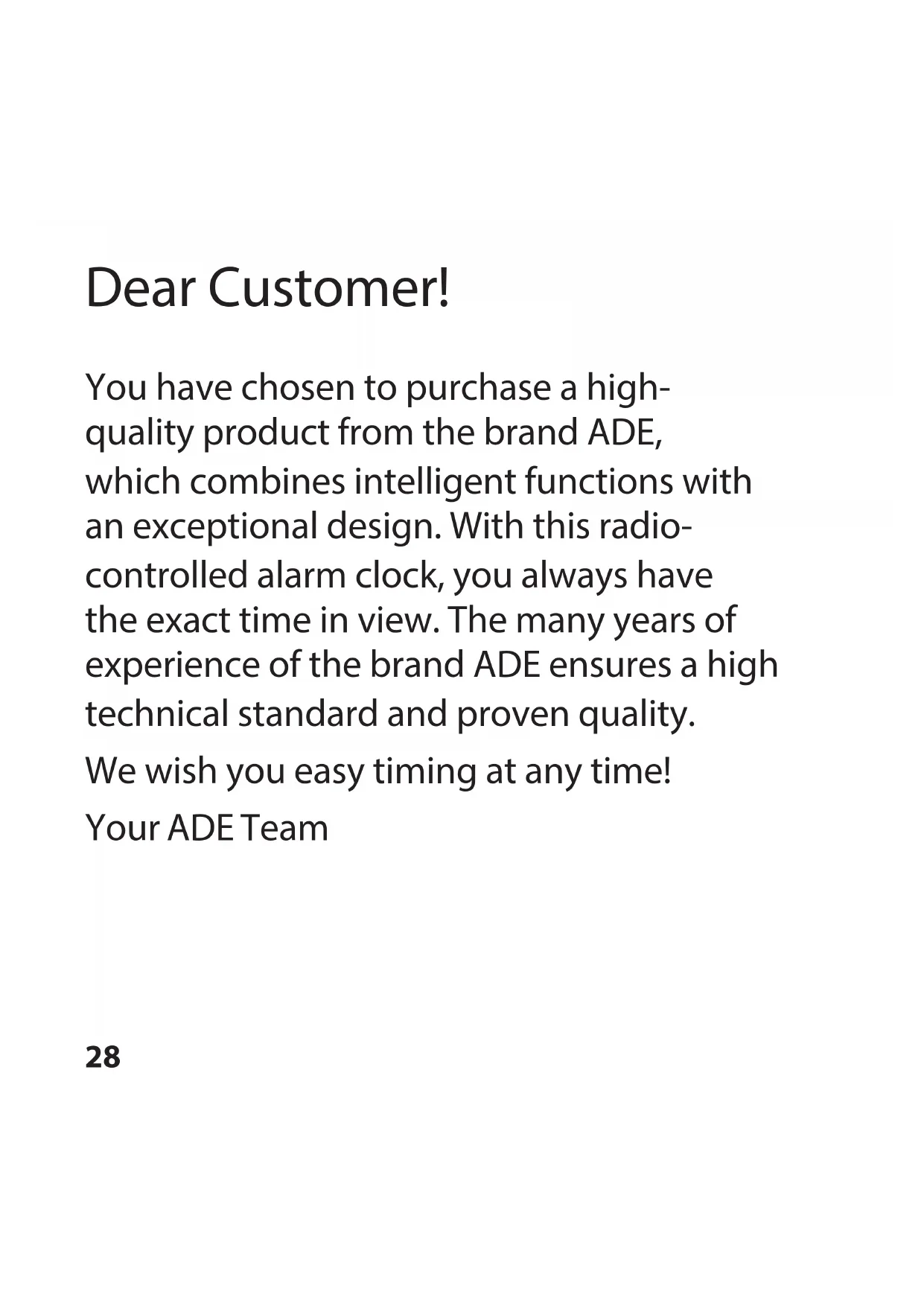 Technical Data Model: DCF Radio-controlled alarm clock CK 1808 Battery: 1x LR03 (AAA), 1.5 V Rated current: < 180 μA Measuring range: approx. -10 °C - 60 °C Distributor (no service address): Waagen-Schmitt GmbH Hammer Steindamm 27-29 22089 Hamburg, Germany Our products are constantly being developed and improved. For this reason, design and technical modifications are possible at any time.50 Declaration of Conformity Waagen-Schmitt GmbH hereby declares that the radio-controlled alarm clock CK 1808 is in compliance with EU directives 2014/53/EU and 2011/65/EU. The full text of the EU declaration of conformity is available at the following internet address: www.ade-germany.de/doc This declaration loses its validity if any modification is made to the alarm clock that has not been agreed with us in advance. Hamburg, july 2018 Waagen-Schmitt GmbH51