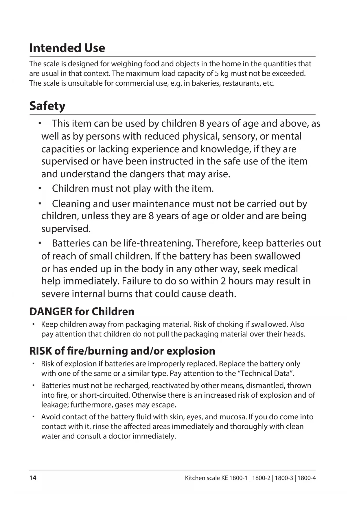 Kitchen scale KE 1800-1 | 1800-2 | 1800-3 | 1800-4 Intended Use The scale is designed for weighing food and objects in the home in the quantities that are usual in that context. The maximum load capacity of 5 kg must not be exceeded. The scale is unsuitable for commercial use, e.g. in bakeries, restaurants, etc. Safety This item can be used by children 8 years of age and above, as well as by persons with reduced physical, sensory, or mental capacities or lacking experience and knowledge, if they are supervised or have been instructed in the safe use of the item and understand the dangers that may arise. Children must not play with the item. Cleaning and user maintenance must not be carried out by children, unless they are 8 years of age or older and are being supervised. Batteries can be life-threatening. Therefore, keep batteries out of reach of small children. If the battery has been swallowed or has ended up in the body in any other way, seek medical help immediately. Failure to do so within 2 hours may result in severe internal burns that could cause death. DANGER for Children Keep children away from packaging material. Risk of choking if swallowed. Also pay attention that children do not pull the packaging material over their heads. RISK of fire/burning and/or explosion Risk of explosion if batteries are improperly replaced. Replace the battery only with one of the same or a similar type. Pay attention to the “Technical Data”. Batteries must not be recharged, reactivated by other means, dismantled, thrown into re, or short-circuited. Otherwise there is an increased risk of explosion and of leakage; furthermore, gases may escape. Avoid contact of the battery uid with skin, eyes, and mucosa. If you do come into contact with it, rinse the aected areas immediately and thoroughly with clean water and consult a doctor immediately.Safety