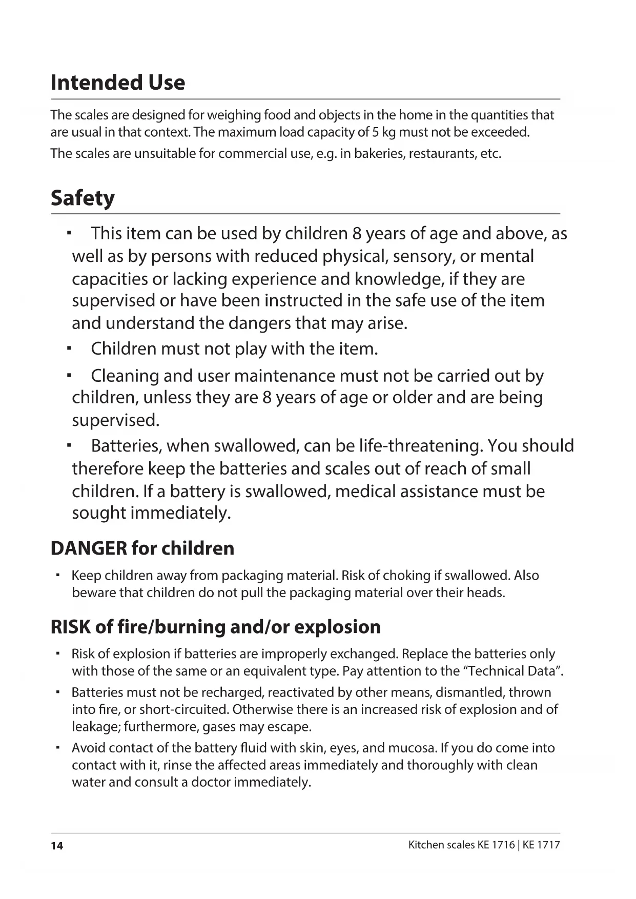 Kitchen scales KE 1716 | KE 1717 Intended Use The scales are designed for weighing food and objects in the home in the quantities that are usual in that context. The maximum load capacity of 5 kg must not be exceeded. The scales are unsuitable for commercial use, e.g. in bakeries, restaurants, etc. Safety This item can be used by children 8 years of age and above, as well as by persons with reduced physical, sensory, or mental capacities or lacking experience and knowledge, if they are supervised or have been instructed in the safe use of the item and understand the dangers that may arise. Children must not play with the item. Cleaning and user maintenance must not be carried out by children, unless they are 8 years of age or older and are being supervised. Batteries, when swallowed, can be life-threatening. You should therefore keep the batteries and scales out of reach of small children. If a battery is swallowed, medical assistance must be sought immediately. DANGER for children Keep children away from packaging material. Risk of choking if swallowed. Also beware that children do not pull the packaging material over their heads. RISK of fire/burning and/or explosion Risk of explosion if batteries are improperly exchanged. Replace the batteries only with those of the same or an equivalent type. Pay attention to the “Technical Data”. Batteries must not be recharged, reactivated by other means, dismantled, thrown into re, or short-circuited. Otherwise there is an increased risk of explosion and of leakage; furthermore, gases may escape. Avoid contact of the battery uid with skin, eyes, and mucosa. If you do come into contact with it, rinse the aected areas immediately and thoroughly with clean water and consult a doctor immediately. Druckbuch SHIRIN THELMA.indb 14 18.05.2017 10:57:03Safety