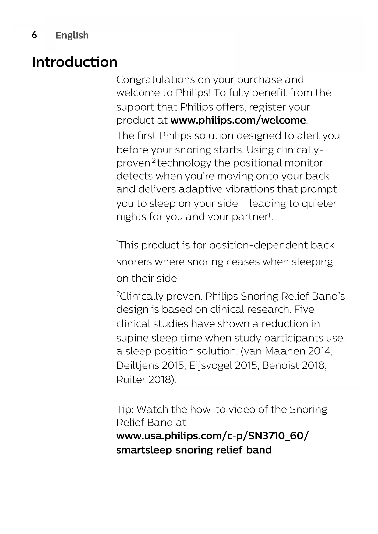 Clinically proven. Philips Snoring Relief Band’s design is based on clinical research. Five clinical studies have shown a reduction in supine sleep time when study participants use a sleep position solution. (van Maanen 2014, Deiltjens 2015, Eijsvogel 2015, Benoist 2018, Ruiter 2018). Tip: Watch the how-to video of the Snoring Relief Band at www.usa.philips.com/c-p/SN3710_60/ smartsleep-snoring-relief-band