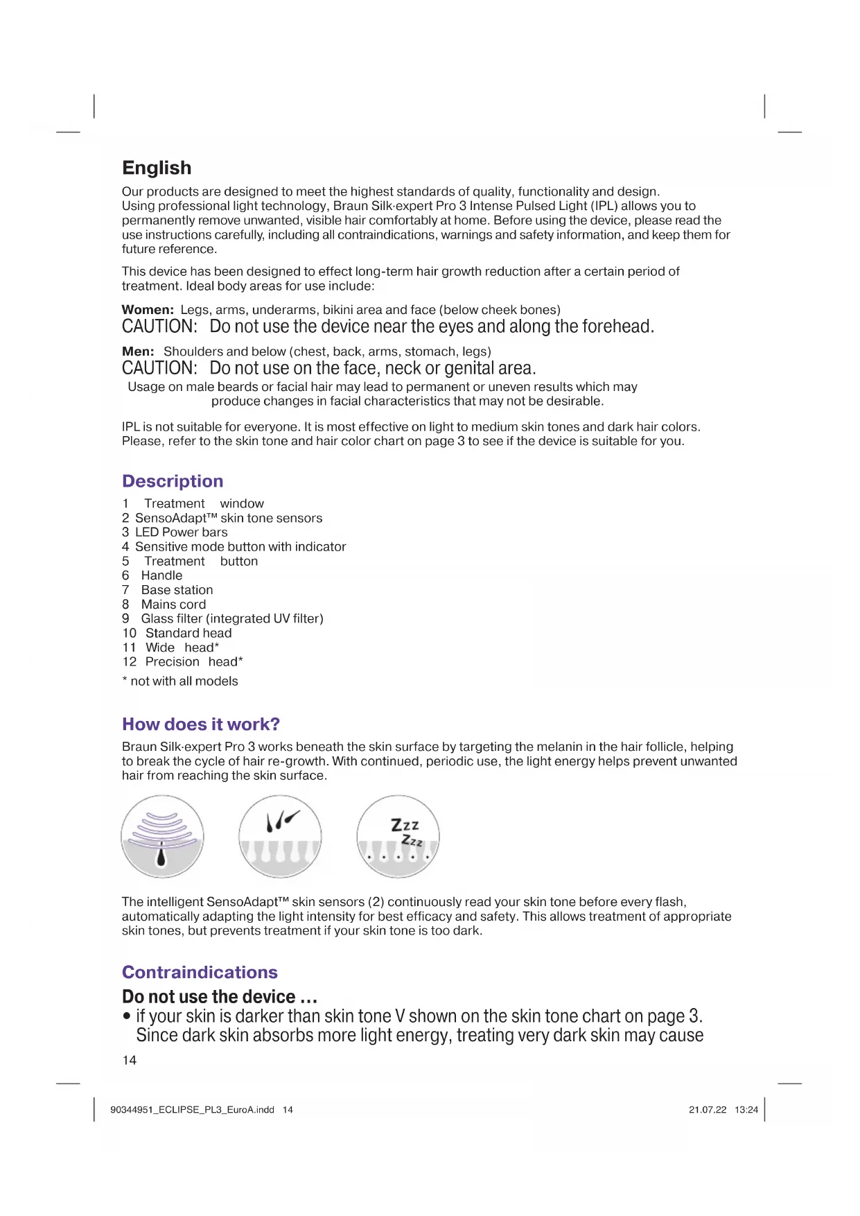 Children should be supervised to ensure that they do not play with the device. Always keep the device out of children’s reach. Electrical and fire safety Regularly check the device and cords for visible signs of damage. In case of damage or cracks, stop using the device. Electric shock may result from using a damaged device. In case of defects, have the device checked and repaired by an authorized service center. Unqualified repair work can lead to extreme hazards for the user. Always unplug the device after use. DANGER Never attempt to repair and open the device, as this may expose you to dangerous electrical components and to pulsed light energy, either of which may cause serious bodily damage and/or permanent eye injury. Do not use in or near water and wet surfaces such as bathtubs, showers, basins or other vessels that may contain water. If the device becomes wet, it should not be used. Electric shock may result from using a wet device. Do not use if the device is damaged (e.g. cracked housing, cord damage etc). Internal parts contain electric charges that are hazardous. Regularly inspect the treatment window (1) for damage: Do not use if the glass filter (9) is cracked or missing. Do not use if the built-in reflector is missing or not in correct place. 90344951_ECLIPSE_PL3_EuroA.indd 1690344951_ECLIPSE_PL3_EuroA.indd 16 21.07.22 13:2421.07.22 13:2417 Do not touch the glass filter during or directly after use since it will get hot. Do not use petroleum-based or flammable cleaning agents (alcohol, acetones) on the device as these pose a fire risk. Do not use abrasive cleaning agents. These may damage the device or scratch the glass filter. Do not attempt to use this device other than for removing unwanted hair. Do not use the device on a surface other than skin. Do not press the treatment button when the treatment window (1) is not placed in full contact with the skin. Do not block the cooling vents. The device may overheat and pose an electric shock risk or fire hazard. How to use Preparing the treatment area Remove any visible hair on the skin before using the device. You may use your preferred hair removal method. To keep the treatment window clean and prevent hair burns, ensure there is no hair remaining on the skin surface. Clean the treatment area and pat it dry. To power on the device: Use the mains cord (8) to connect the base station to an electrical outlet. Press any button (4 or 5) to activate the device. The LED power bars (3) will light up once and, a fan starts running. This means the device is in READY mode. During operation, the device will heat up slightly. Automatic light adaptation When both skin tone sensors (2) have skin contact, the device reads your skin tone and selects the appropriate light intensity which is indicated by white LEDs on the Power bars (3). These confirm that the device is ready to flash. light skin tone ➞ high light intensity dark skin tone ➞low light intensity no LEDs no skin contact ➞device will not flash red LED invalid skin tone ➞device will not flash Sensitive mode Push the sensitive mode button (4) to reduce the light intensity. The sensitive mode indicator lights up when it is activated. To deactivate it, press the sensitive mode button again. The power bars flash to confirm a change in the light intensity setting. When holding the sensitive mode button (4) longer than 3 seconds, the device is deactivated. After 10 minutes without use, the device is automatically deactivated. Press any button to reactivate it. Patch Test Before your first treatment, we recommend you test your skin for reaction to Braun Silk·expert on a small area of skin of the body part you plan to treat (about 2 x 3 cm in size; equivalent to the size of two flashes, side by side). 90344951_ECLIPSE_PL3_EuroA.indd 1790344951_ECLIPSE_PL3_EuroA.indd 17 21.07.22 13:2421.07.22 13:2418 Perform a patch test as described below in chapter «Treatment methods», section «STAMPING». Wait 24 hours to examine the test area. If the skin appears normal, begin your first treatment. If a skin reaction develops, discontinue using the device and consult your physician. Do not treat the patch tested area for at least one week after the test. Treatment methods The area to be treated must be hair-free, clean and dry. Before pushing the treatment button, look away from the device to avoid the bright light. In seldom cases, a user may find the flash too bright. However, there is no safety risk associated with this. For increased comfort, we recommend treating in a well-lit room to help reduce the perceived brightness. GLIDING for fast and efficient treatment of large areas (e.g. legs). STAMPING for treating small, hard-to reach areas (e.g. face for females, bikini line, underarms, knee, chin, ankles)