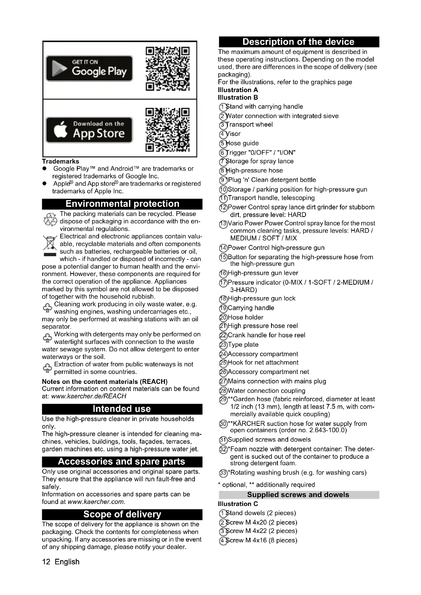 are trademarks or registered trademarks of Apple Inc. Environmental protection The packing materials can be recycled. Please dispose of packaging in accordance with the en- vironmental regulations. Electrical and electronic appliances contain valu- able, recyclable materials and often components such as batteries, rechargeable batteries or oil, which - if handled or disposed of incorrectly - can pose a potential danger to human health and the envi- ronment. However, these components are required for the correct operation of the appliance. Appliances marked by this symbol are not allowed to be disposed of together with the household rubbish. Cleaning work producing in oily waste water, e.g. washing engines, washing undercarriages etc., may only be performed at washing stations with an oil separator. Working with detergents may only be performed on watertight surfaces with connection to the waste water sewage system. Do not allow detergent to enter waterways or the soil. Extraction of water from public waterways is not permitted in some countries. Notes on the content materials (REACH) Current information on content materials can be found at: www.kaercher.de/REACH Intended use Use the high-pressure cleaner in private households only. The high-pressure cleaner is intended for cleaning ma- chines, vehicles, buildings, tools, façades, terraces, garden machines etc. using a high-pressure water jet. Accessories and spare parts Only use original accessories and original spare parts. They ensure that the appliance will run fault-free and safely. Information on accessories and spare parts can be found at www.kaercher.com. Scope of delivery The scope of delivery for the appliance is shown on the packaging. Check the contents for completeness when unpacking. If any accessories are missing or in the event of any shipping damage, please notify your dealer. Description of the device The maximum amount of equipment is described in these operating instructions. Depending on the model used, there are differences in the scope of delivery (see packaging). For the illustrations, refer to the graphics page Illustration A Illustration B 1 Stand with carrying handle 2 Water connection with integrated sieve 3 Transport wheel 4 Visor 5 Hose guide 6 Trigger "0/OFF" / "I/ON" 7 Storage for spray lance 8 High-pressure hose 9 *Plug 'n' Clean detergent bottle 10 Storage / parking position for high-pressure gun 11 Transport handle, telescoping 12 Power Control spray lance dirt grinder for stubborn dirt, pressure level: HARD 13 Vario Power Power Control spray lance for the most common cleaning tasks, pressure levels: HARD /