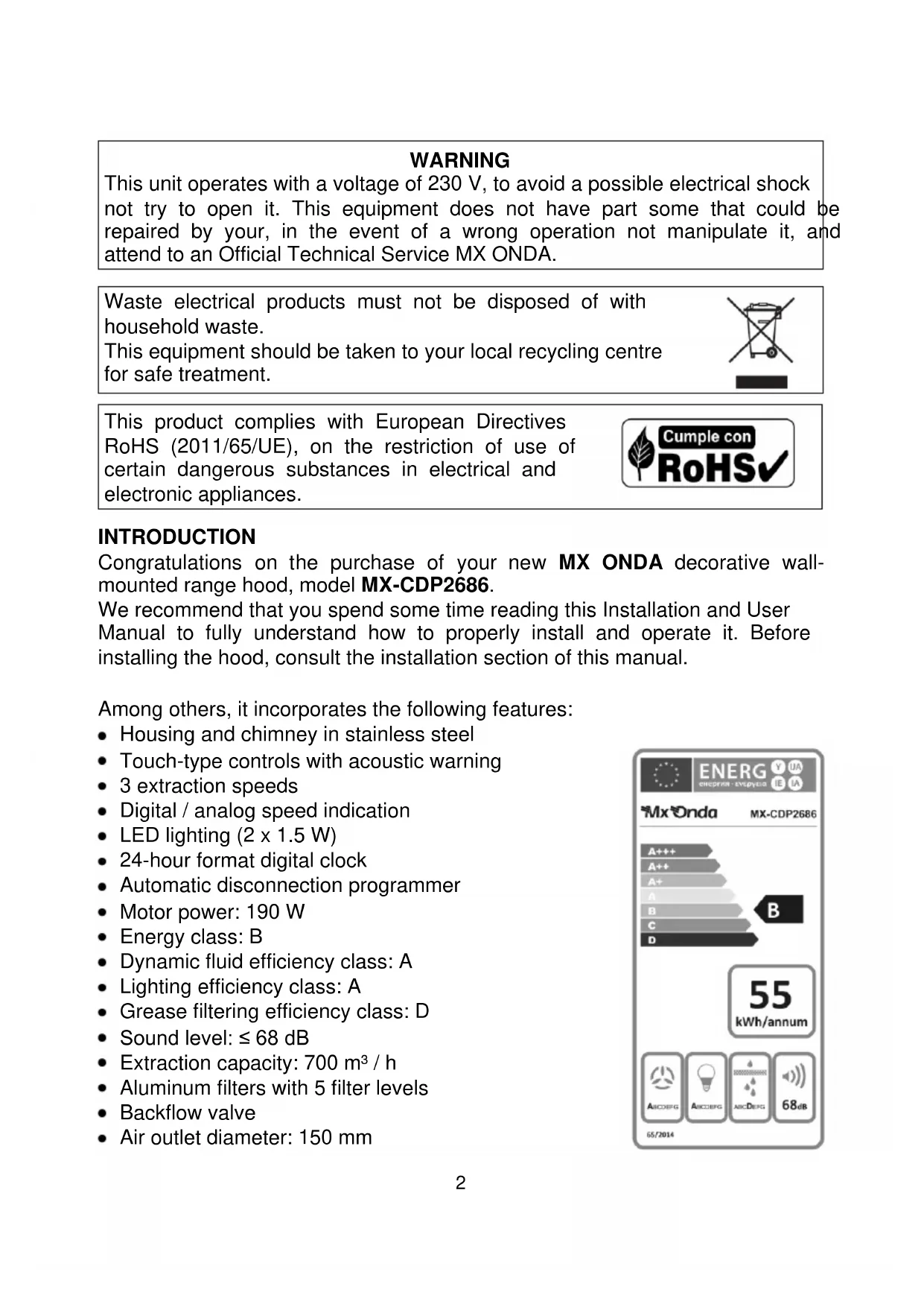 WARNING This unit operates with a voltage of 230 V, to avoid a possible electrical shock not try to open it. This equipment does not have part some that could be repaired by your, in the event of a wrong operation not manipulate it, and attend to an Official Technical Service MX ONDA. Waste electrical products must not be disposed of with household waste. This equipment should be taken to your local recycling centre for safe treatment. This product complies with European Directives RoHS (2011/65/UE), on the restriction of use of certain dangerous substances in electrical and electronic appliances. INTRODUCTION Congratulations on the purchase of your new MX ONDA decorative wall- mounted range hood, model MX-CDP2686. We recommend that you spend some time reading this Installation and User Manual to fully understand how to properly install and operate it. Before installing the hood, consult the installation section of this manual.