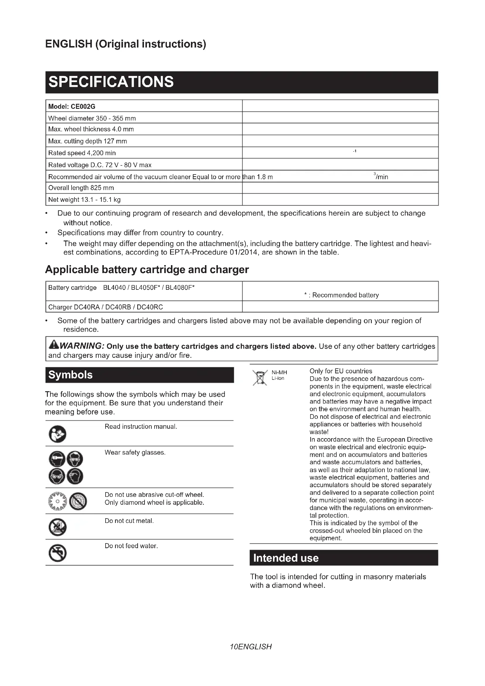 andchargersmaycauseinjuryand/orre. Symbols Thefollowingsshowthesymbolswhichmaybeused fortheequipment.Besurethatyouunderstandtheir meaningbeforeuse. Read instruction manual. Wearsafetyglasses. Donotuseabrasivecut-owheel. Onlydiamondwheelisapplicable. Do not cut metal. Do not feed water. Ni-MH Li-ion OnlyforEUcountries Due to the presence of hazardous com- ponents in the equipment, waste electrical and electronic equipment, accumulators andbatteriesmayhaveanegativeimpact on the environment and human health. Do not dispose of electrical and electronic appliancesorbatterieswithhousehold waste! In accordance with the European Directive on waste electrical and electronic equip- mentandonaccumulatorsandbatteries andwasteaccumulatorsandbatteries, as well as their adaptation to national law, wasteelectricalequipment,batteriesand accumulatorsshouldbestoredseparately and delivered to a separate collection point for municipal waste, operating in accor- dance with the regulations on environmen- tal protection. Thisisindicatedbythesymbolofthe crossed-outwheeledbinplacedonthe equipment. Intended use Thetoolisintendedforcuttinginmasonrymaterials with a diamond wheel.11 ENGLISH Noise ThetypicalA-weightednoiseleveldeterminedaccordingtoEN60745-2-22: Soundpressurelevel(L
