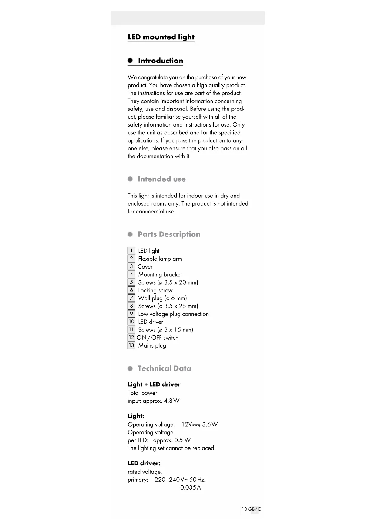 from the socket. The bulb becomes hot during operation. Allow the light and bulb to cool before you touch them. The LEDs cannot be replaced. This product is only suitable to be powered with the included LED driver (GY-CC12V300mA-L-003). Please note, the LED driver will continue to draw a small amount of electricity even with- out the light being operated so long as the mains plug is plugged into the socket. Unplug from the socket to switch the device off com- pletely. The illuminant is not replaceable. If the illuminant fails at the end of its life, the entire light must be replaced.16 GB/IE Installation Mounting the light Move the cover
