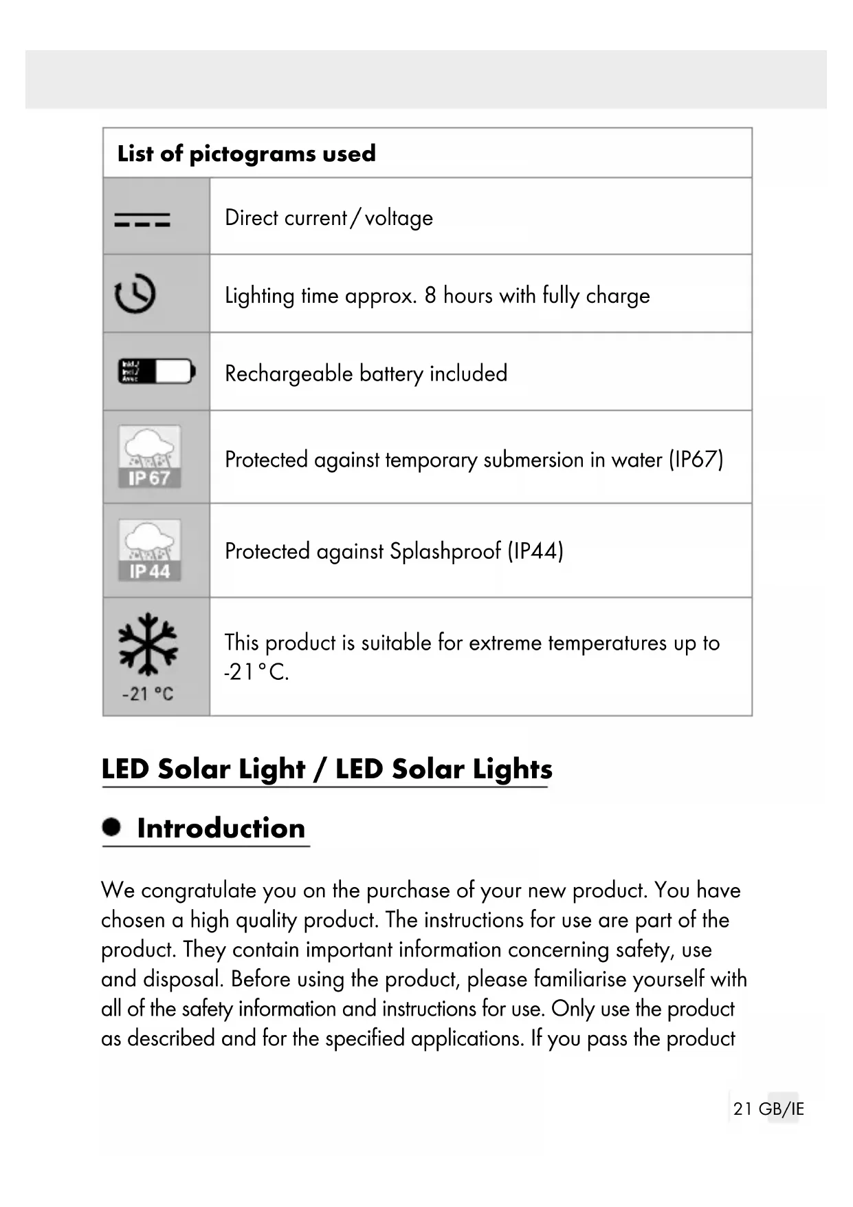 GER TO LIFE FOR INFANTS AND CHILDREN! Keep rechargeable batteries away from children. Do not leave the rechargeable batteries lying around. There is a danger that these will be swallowed by children or pets. If they are accidentally swallowed seek immediate medical attention. Children or persons lacking knowledge or experience in handling the product or have limited physical, sensory or mental abilities, must not use the product without supervision or instruction by a person responsible for their safety. Children must be supervised at all times to prevent them from playing with the product. Never leave children unsupervised with the packaging material. The packaging material poses a suffocation hazard. Children fre- quently underestimate the dangers. Please always keep the product out of the reach of children. This product is not a toy and should be kept out of the reach of children. Children are not aware of the dangers associated with handling electrical products. Do not use the product if you detect any type of damage. The LED is not replaceable. If the LED fails at the end of its life, the entire product must be re- placed. DANGER - EXPLOSION HAZARD! Do not use the product in explosive environments containing flam- mable vapours, gasses or dusts. Product-specific safety instructions Do not expose the product to strong vibration or high mechanical loads.25 GB/IE Make sure the lampshade is free of dirt and free of snow and ice in winter. Otherwise the performance of the solar module