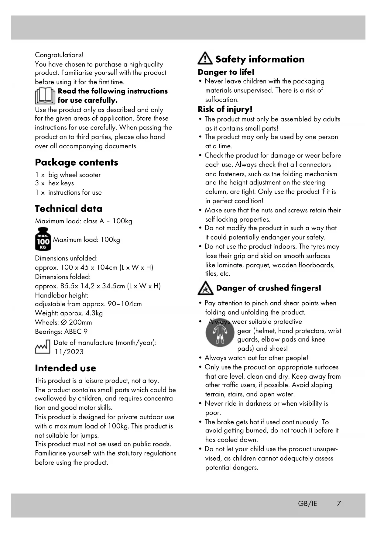 - Swing out the kickstand to park. The product may only be parked on a level surface. Maintenance Replacing the wheels (16) (Fig. H) Important! Pay attention to the section ‘Technical data’. Wheels that have a different diameter may alter the riding characteristics and could possibly en- danger the user. Do not use wheels that cannot be installed properly. Never use wheels that are larger than the original wheels on the product. GB/IE9GB/IE Wheels wear out. This wear depends on many factors, for example, the terrain, the size and weight of the user, the weather conditions, the material of the wheels and their hardness. It is therefore necessary to replace them regularly.