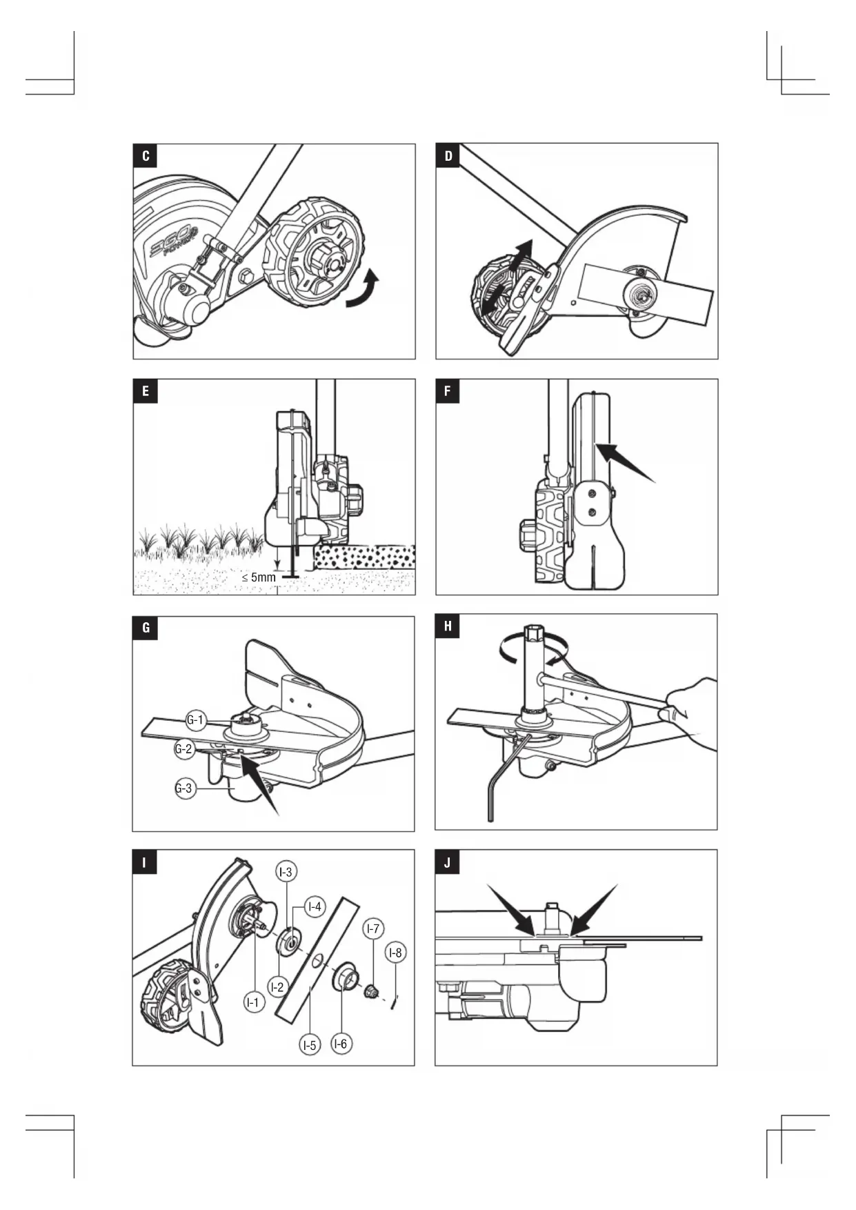 heavy gloves or wrapping the blade with rags or other materials when performing any maintenance on the edger blade. Removing the blade 1. Stop the motor and remove the battery pack. 2. Lay the edger on its back so that the blade is facing upwards.3. Wear protective gloves. Use a needle nose pliers (not included) to remove the cotter pin from the motor shaft (Fig. G).4. Rotate the blade to align the slot in the ange with the hole in the gear case (Fig. G). Fig. G parts description see below:G-1 Cotter PinG-2 Inner FlangeG-3 Gear Case5. Insert the hex wrench provided into the aligned holes to act as a stabilizer. Use the multi-functional wrench provided to loosen the nut CLOCKWISE (Fig. H).6. Remove the nut, outer ange, blade and the inner ange from the motor shaft (Fig. I). Check and replace them if they are worn. Fig. I parts description see below:I-1 Motor Shaft I-5 BladeI-2 Inner Flange I-6 Outer FlangeI-3 Slot in the Inner Flange I-7 NutI-4 Bulge on the Inner Flange I-8 Cotter Pin Installing the blade 1. Position the inner ange onto the motor shaft with bulge facing outwards (Fig. I).2. Install the new blade onto the inner ange, ensuring that the blade is mounted into its place securely (Fig. J).3. Mount the outer ange and the nut onto the shaft, and pre-tighten the nut COUNTERCLOCKWISE by hand.4. Follow the above step 4 & 5 in “Removing the blade” to stabilize the blade to securely tighten the nut in COUNTERCLOCKWISE.5. Insert a new cotter pin supplied into the hole in the motor shaft. Bent the two feet of the pin in opposite directions with a needle nose pliers (not included) (Fig. G).