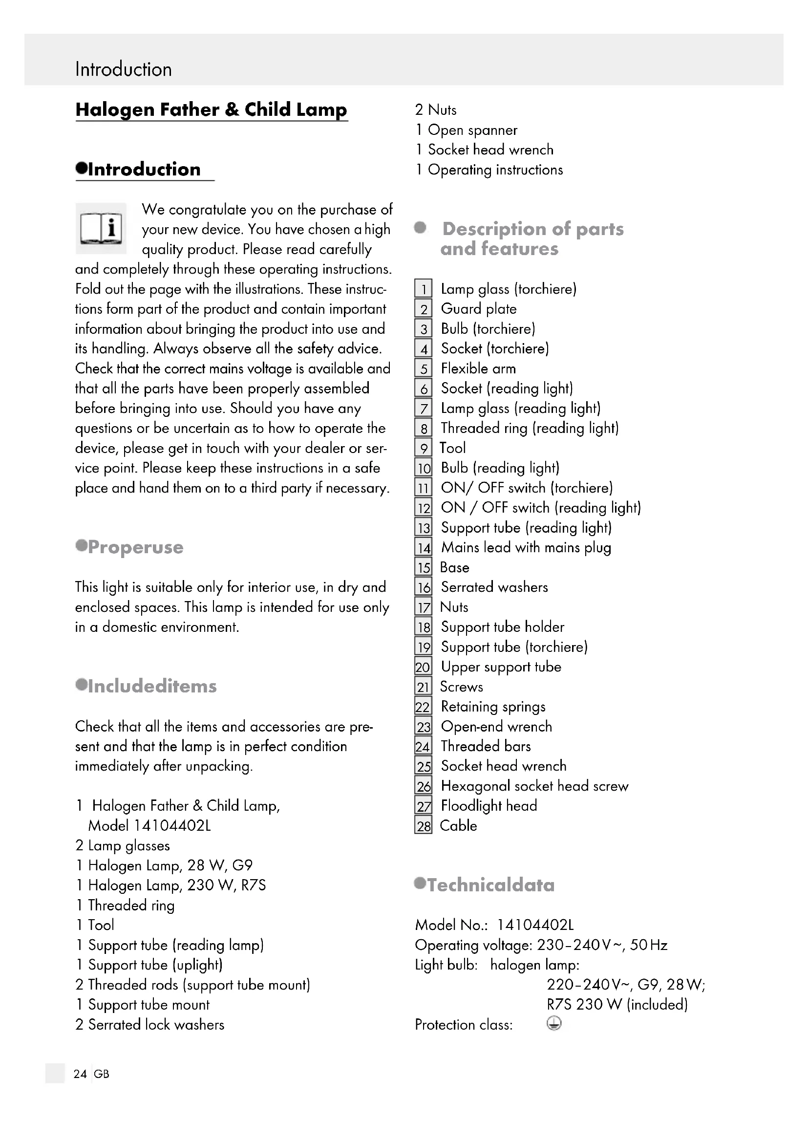 Cable Technical data Model No.: 14104402L Operating voltage: 230–240 V ∼, 50 Hz Light bulb: halogen lamp: 220–240 V∼, G9, 28 W; R7S 230 W (included) Protection class:25 GB Safety Safety Safety advice The right to claim under the guarantee shall be rendered invalid in respect of damage caused by the non-observance of these operating instructions! No liability is accepted for consequent damage! No liability is accepted for damage to property or persons caused by improper handling or non- observance of the safety advice! To avoid danger to life from electric shock Every time before connecting the lamp the mains, check it and the mains lead for damage. Never use your light if you find it is damaged in any way. CAUTION! A damaged light bulb means your life is at risk from electric shock. If there is any damage, repairs to be carried out or other problems related to the light bulb, please contact the service centre or a qualified electrician. In order to prevent hazards, if the outer flexible cable of this lamp becomes damaged it may only be replaced by the manufacturer, a service representative of the manufacturer or a similar specialist! Before assembly, ensure that the mains voltage available corresponds to the operating voltage necessary of the light (230–240 V ∼). Never let the lamp come into contact with water or other liquids. Always unplug the light from the mains prior to assembly, disassembly, cleaning or if the light will not be used for extended periods. Never open or insert anything into electrical fittings or equipment. Doing this sort of thing can lead to a serious danger to life from electric shock. To avoid danger of fire and injury CAUTION! RISK OF INJURY! Check bulbs for damage immediately after unpacking. Do not fit defective bulbs into the light. If they are, contact the service point for a replacement.