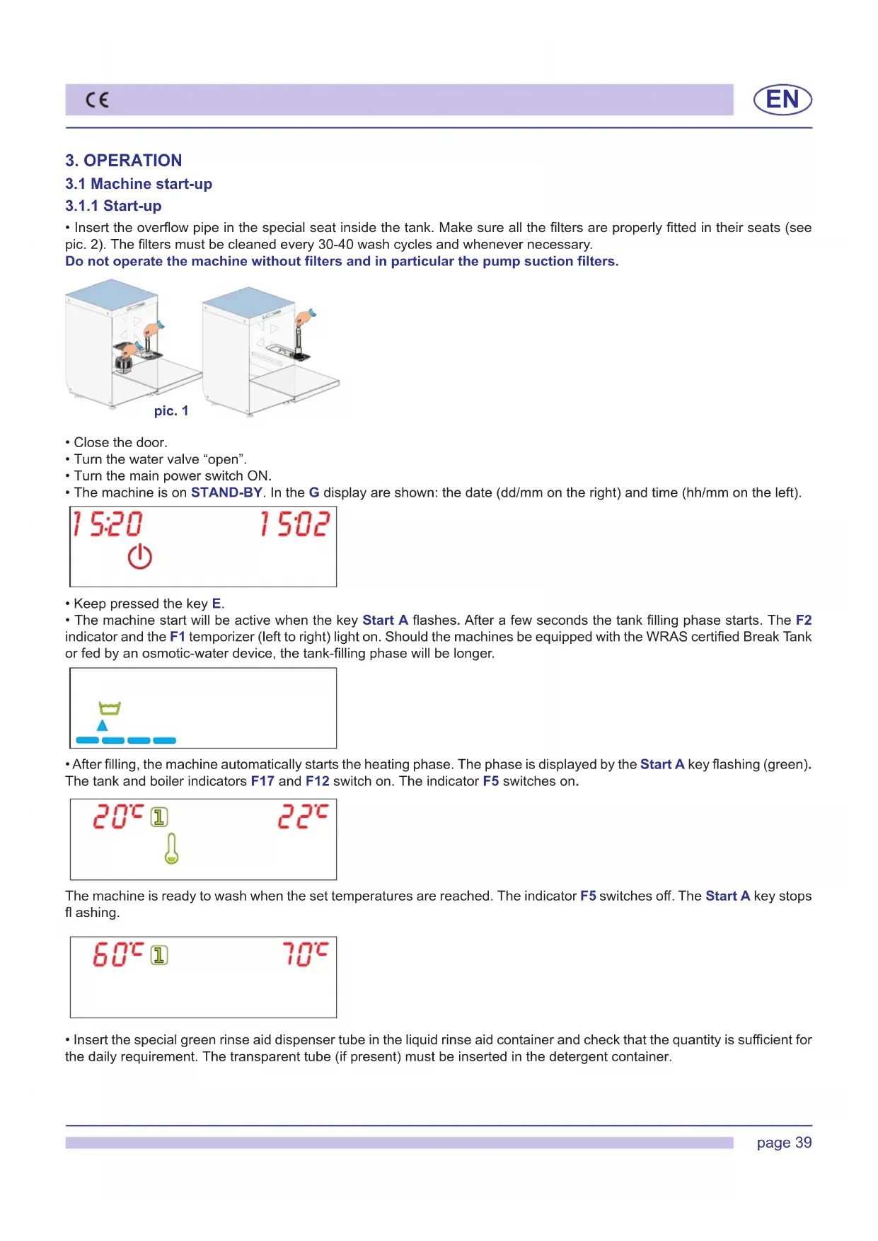 - After fi lling, the machine automatically starts the heating phase. The phase is displayed by the Start A key fl ashing (green). The tank and boiler indicators F17 and F12 switch on. The indicator F5 switches on. The machine is ready to wash when the set temperatures are reached. The indicator F5 switches off . The Start A key stops fl ashing. pic. 1