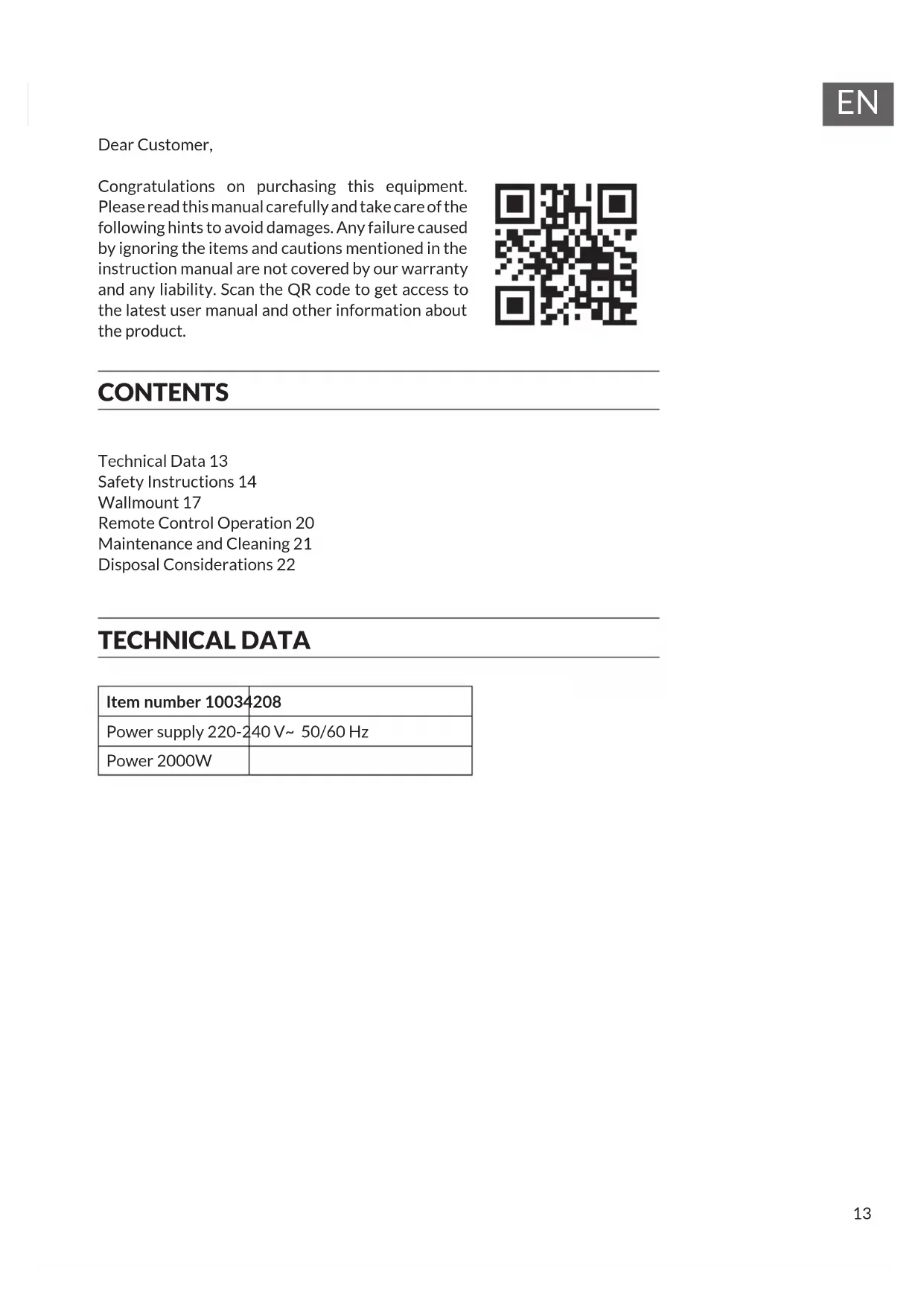 Dear Customer, Congratulations on purchasing this equipment. Please read this manual carefully and take care of the following hints to avoid damages. Any failure caused by ignoring the items and cautions mentioned in the instruction manual are not covered by our warranty and any liability. Scan the QR code to get access to the latest user manual and other information about the product. CONTENTS Technical Data 13 Safety Instructions 14 Wallmount 17 Remote Control Operation 20 Maintenance and Cleaning 21 Disposal Considerations 22 TECHNICAL DATA Item number 10034208 Power supply 220-240 V~ 50/60 Hz Power 2000W14