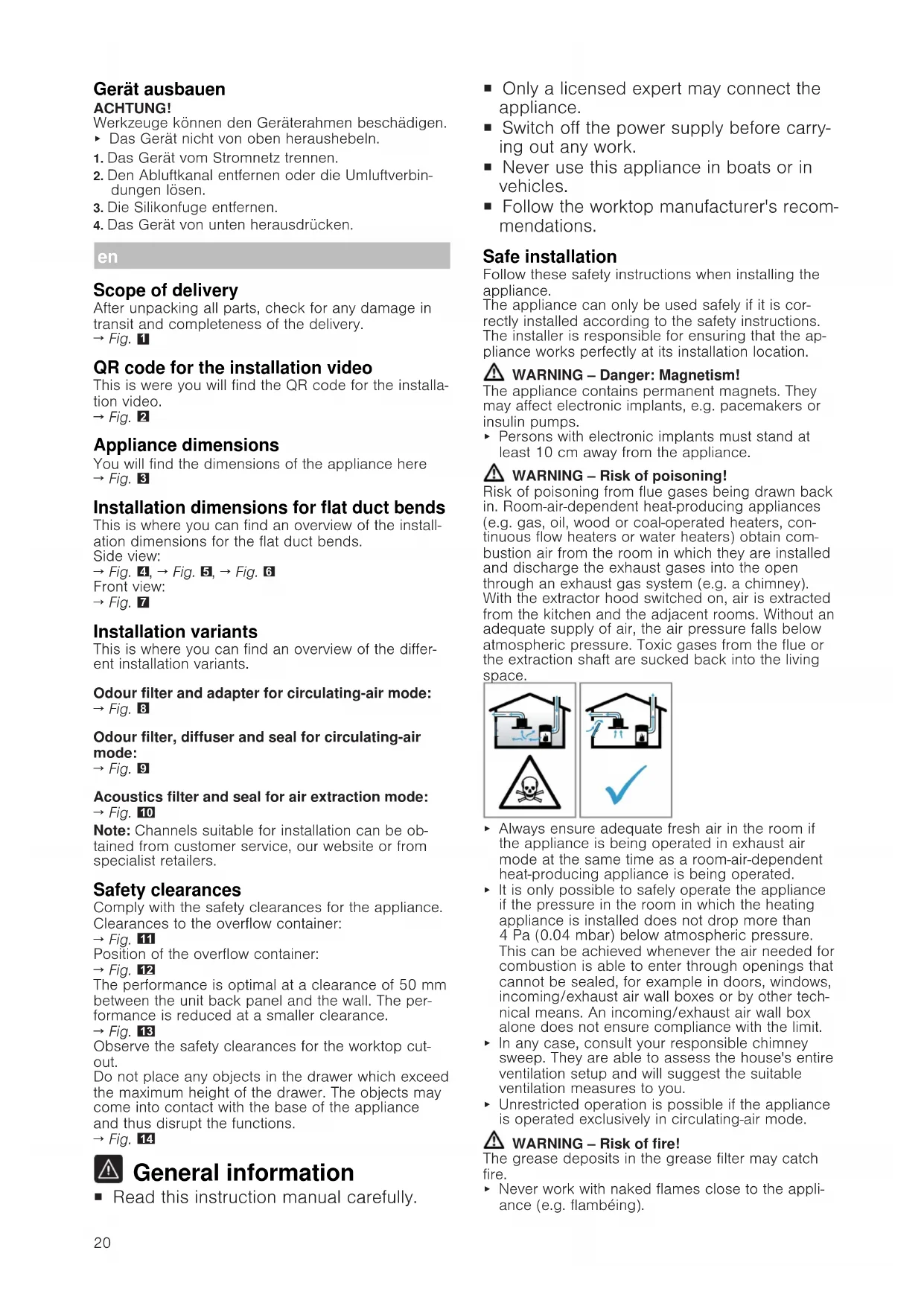 General information ¡ Read this instruction manual carefully. ¡ Only a licensed expert may connect the appliance. ¡ Switch off the power supply before carry- ing out any work. ¡ Never use this appliance in boats or in vehicles. ¡ Follow the worktop manufacturer's recom- mendations. Safe installation Follow these safety instructions when installing the appliance. The appliance can only be used safely if it is cor- rectly installed according to the safety instructions. The installer is responsible for ensuring that the ap- pliance works perfectly at its installation location. WARNING‒Danger: Magnetism! The appliance contains permanent magnets. They may affect electronic implants, e.g. pacemakers or insulin pumps. ▶ Persons with electronic implants must stand at least 10cm away from the appliance. WARNING‒Risk of poisoning! Risk of poisoning from flue gases being drawn back in. Room-air-dependent heat-producing appliances (e.g. gas, oil, wood or coal-operated heaters, con- tinuous flow heaters or water heaters) obtain com- bustion air from the room in which they are installed and discharge the exhaust gases into the open through an exhaust gas system (e.g. a chimney). With the extractor hood switched on, air is extracted from the kitchen and the adjacent rooms. Without an adequate supply of air, the air pressure falls below atmospheric pressure. Toxic gases from the flue or the extraction shaft are sucked back into the living space. ▶ Always ensure adequate fresh air in the room if the appliance is being operated in exhaust air mode at the same time as a room-air-dependent heat-producing appliance is being operated. ▶ It is only possible to safely operate the appliance if the pressure in the room in which the heating appliance is installed does not drop more than 4Pa(0.04mbar) below atmospheric pressure. This can be achieved whenever the air needed for combustion is able to enter through openings that cannot be sealed, for example in doors, windows, incoming/exhaust air wall boxes or by other tech- nical means. An incoming/exhaust air wall box alone does not ensure compliance with the limit. ▶ In any case, consult your responsible chimney sweep. They are able to assess the house's entire ventilation setup and will suggest the suitable ventilation measures to you. ▶ Unrestricted operation is possible if the appliance is operated exclusively in circulating-air mode. WARNING‒Risk of fire! The grease deposits in the grease filter may catch fire. ▶ Never work with naked flames close to the appli- ance (e.g. flambéing).21 ▶ Do not install the appliance near a heat-producing appliance for solid fuel (e.g. wood or coal) unless a closed, non-removable cover is present. There must be no flying sparks. WARNING‒Risk of injury! Changes to the electrical or mechanical assembly are dangerous and may lead to malfunctions. ▶ Do not make any changes to the electrical or mechanical assembly. Parts that are accessible during installation may have sharp edges and may lead to cutting injuries. ▶ Wear protective gloves The appliance is heavy. ▶ To move the appliance, twopeople are required. ▶ Use only suitable tools and equipment. WARNING‒Risk of suffocation! Children may put packaging material over their heads or wrap themselves up in it and suffocate. ▶ Keep packaging material away from children. ▶ Do not let children play with packaging material. WARNING‒Risk of poisoning! Risk of poisoning from flue gases being drawn back in. ▶ Do not emit the exhaust air into a smoke or ex- haust gas flue that is in operation. ▶ Do not emit the exhaust air into a shaft that is used to ventilate installation rooms for heat-produ- cing appliances. ▶ If the exhaust air is to be conveyed into a smoke or exhaust gas flue, you must obtain the consent of the heating engineer responsible. Risk of poisoning from flue gases being drawn back in. ▶ If an extractor hood with an open-flued heat pro- duction source is installed, the power supply for the extractor hood must be provided with a suit- able safety switch. Information about the electrical connection In order to safely connect the appliance to the elec- trical system, follow these instructions. WARNING‒Risk of electric shock! It must always be possible to disconnect the appli- ance from the electricity supply. The appliance must only be connected to a mains socket that has been installed correctly. ▶ An all-pole isolating switch must be integrated into the permanent electrical installation in accordance with the conditions of overvoltage category III and in accordance with the installation regulations. ▶ The permanent electrical installation must only be wired by a professional electrician. We recom- mend installing a residual-current circuit breaker (RCCB) in the appliance's power supply circuit. ¡ Do not kink or trap the connection cable, and keep it away from sharp edges. ¡ Route the connection cable in such a way that it does not touch the hot casing. ¡ Use only the connection cable that is supplied with the appliance or is provided by technical after-sales service. ¡ This appliance complies with the EC interference suppression regulations. ¡ The appliance corresponds to protection class 1. You should therefore only use the appliance with a protective earth connection. ¡ The manufacturer shall assume no liability for mal- functions or damage resulting from incorrect elec- trical wiring. Preparing the electrical connection Requirement:Only after-sales service staff who have been trained accordingly may carry out work on the inside of the appliance or replace the power cord.
