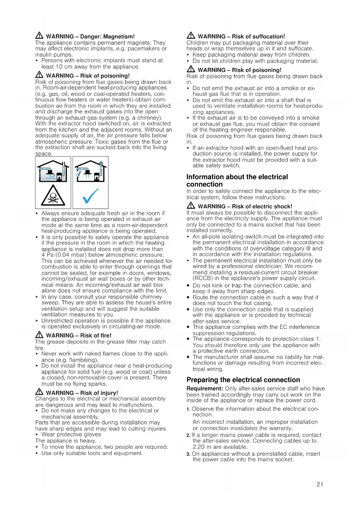 General information ¡ Read this instruction manual carefully. ¡ Only a licensed expert may connect the appliance. ¡ Switch off the power supply before carry- ing out any work. ¡ Never use this appliance in boats or in vehicles. ¡ Follow the worktop manufacturer's recom- mendations. Safe installation Follow these safety instructions when installing the appliance. The appliance can only be used safely if it is cor- rectly installed according to the safety instructions. The installer is responsible for ensuring that the ap- pliance works perfectly at its installation location.21 WARNING‒Danger: Magnetism! The appliance contains permanent magnets. They may affect electronic implants, e.g. pacemakers or insulin pumps. ▶ Persons with electronic implants must stand at least 10cm away from the appliance. WARNING‒Risk of poisoning! Risk of poisoning from flue gases being drawn back in. Room-air-dependent heat-producing appliances (e.g. gas, oil, wood or coal-operated heaters, con- tinuous flow heaters or water heaters) obtain com- bustion air from the room in which they are installed and discharge the exhaust gases into the open through an exhaust gas system (e.g. a chimney). With the extractor hood switched on, air is extracted from the kitchen and the adjacent rooms. Without an adequate supply of air, the air pressure falls below atmospheric pressure. Toxic gases from the flue or the extraction shaft are sucked back into the living space. ▶ Always ensure adequate fresh air in the room if the appliance is being operated in exhaust air mode at the same time as a room-air-dependent heat-producing appliance is being operated. ▶ It is only possible to safely operate the appliance if the pressure in the room in which the heating appliance is installed does not drop more than 4Pa(0.04mbar) below atmospheric pressure. This can be achieved whenever the air needed for combustion is able to enter through openings that cannot be sealed, for example in doors, windows, incoming/exhaust air wall boxes or by other tech- nical means. An incoming/exhaust air wall box alone does not ensure compliance with the limit. ▶ In any case, consult your responsible chimney sweep. They are able to assess the house's entire ventilation setup and will suggest the suitable ventilation measures to you. ▶ Unrestricted operation is possible if the appliance is operated exclusively in circulating-air mode. WARNING‒Risk of fire! The grease deposits in the grease filter may catch fire. ▶ Never work with naked flames close to the appli- ance (e.g. flambéing). ▶ Do not install the appliance near a heat-producing appliance for solid fuel (e.g. wood or coal) unless a closed, non-removable cover is present. There must be no flying sparks. WARNING‒Risk of injury! Changes to the electrical or mechanical assembly are dangerous and may lead to malfunctions. ▶ Do not make any changes to the electrical or mechanical assembly. Parts that are accessible during installation may have sharp edges and may lead to cutting injuries. ▶ Wear protective gloves The appliance is heavy. ▶ To move the appliance, twopeople are required. ▶ Use only suitable tools and equipment. WARNING‒Risk of suffocation! Children may put packaging material over their heads or wrap themselves up in it and suffocate. ▶ Keep packaging material away from children. ▶ Do not let children play with packaging material. WARNING‒Risk of poisoning! Risk of poisoning from flue gases being drawn back in. ▶ Do not emit the exhaust air into a smoke or ex- haust gas flue that is in operation. ▶ Do not emit the exhaust air into a shaft that is used to ventilate installation rooms for heat-produ- cing appliances. ▶ If the exhaust air is to be conveyed into a smoke or exhaust gas flue, you must obtain the consent of the heating engineer responsible. Risk of poisoning from flue gases being drawn back in. ▶ If an extractor hood with an open-flued heat pro- duction source is installed, the power supply for the extractor hood must be provided with a suit- able safety switch. Information about the electrical connection In order to safely connect the appliance to the elec- trical system, follow these instructions. WARNING‒Risk of electric shock! It must always be possible to disconnect the appli- ance from the electricity supply. The appliance must only be connected to a mains socket that has been installed correctly. ▶ An all-pole isolating switch must be integrated into the permanent electrical installation in accordance with the conditions of overvoltage category III and in accordance with the installation regulations. ▶ The permanent electrical installation must only be wired by a professional electrician. We recom- mend installing a residual-current circuit breaker (RCCB) in the appliance's power supply circuit. ¡ Do not kink or trap the connection cable, and keep it away from sharp edges. ¡ Route the connection cable in such a way that it does not touch the hot casing. ¡ Use only the connection cable that is supplied with the appliance or is provided by technical after-sales service. ¡ This appliance complies with the EC interference suppression regulations. ¡ The appliance corresponds to protection class 1. You should therefore only use the appliance with a protective earth connection. ¡ The manufacturer shall assume no liability for mal- functions or damage resulting from incorrect elec- trical wiring. Preparing the electrical connection Requirement:Only after-sales service staff who have been trained accordingly may carry out work on the inside of the appliance or replace the power cord.